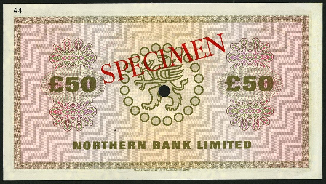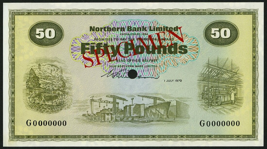 (x) Northern Bank Limited, specimen colour trial £50, 1 July 1970, serial number G 0000000, green and multicoloured, shipyard low centre, Wilson signature