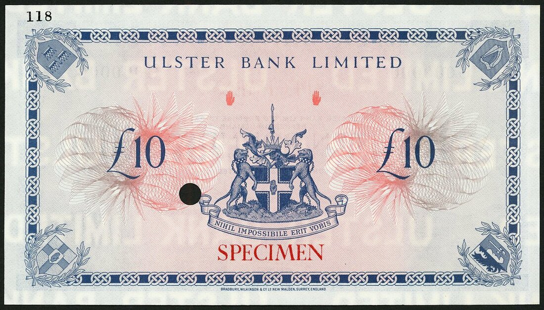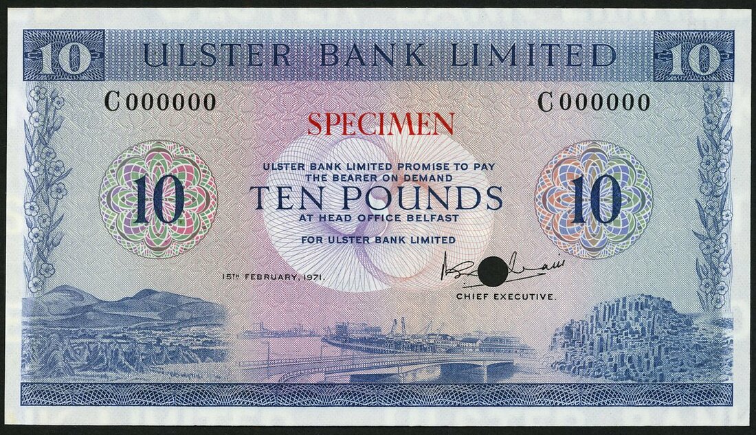 (x) Ulster Bank Limited, colour trial £10, 1 February 1971, serial number C 000000, blue and lilac, Brain signature