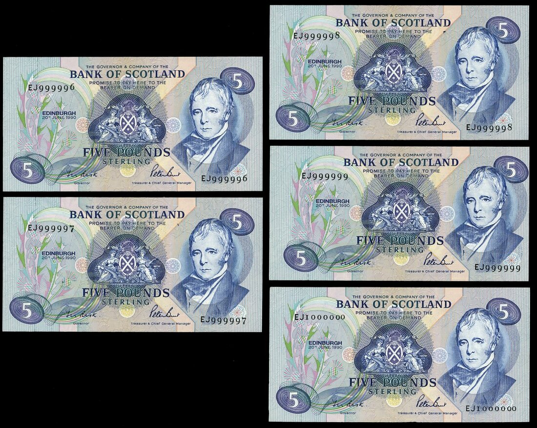 Bank of Scotland, consecutive £5 (5), 20 June 1990, serial numbers EJ 999996-1000000, (PMS BA115a), last five £5 notes bearing Governor Sir Thomas Risk's signature. Minor handling, about uncirculated. Includes a number 1 million note! (5 notes) Enclosed a memo from the cashier's department presenting the notes to Sir Thomas Risk.