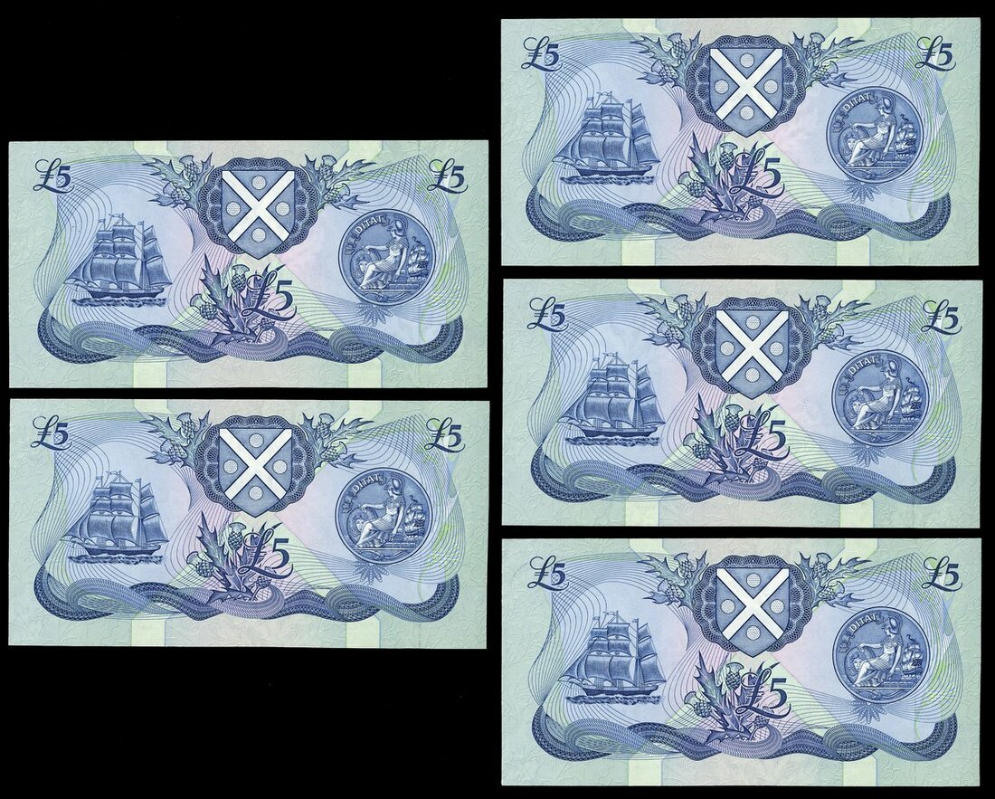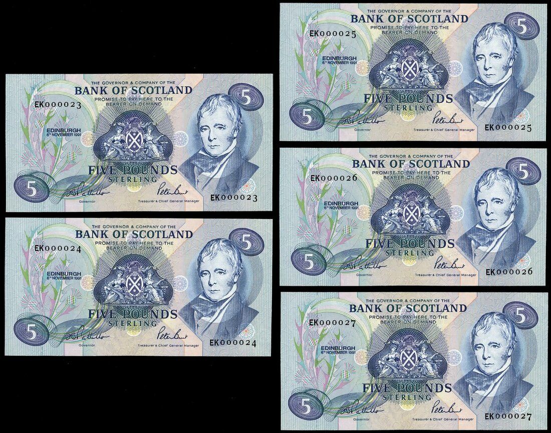 Bank of Scotland, consecutive £5 (5), 6 November 1991, serial numbers EK 000023/24/25/26/27, (PMS BA115b), First prefix of series. Minor handling, about uncirculated. Scarce low numbers. (5 notes)