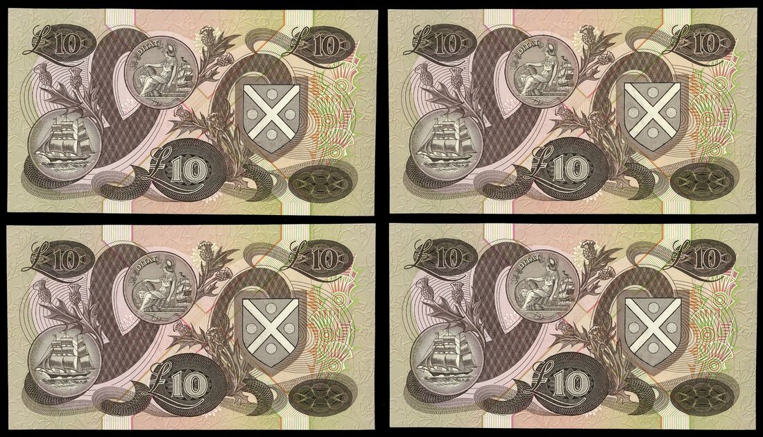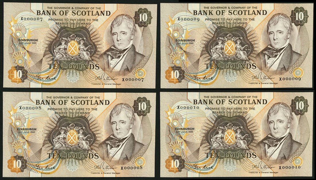 Bank of Scotland, consecutive £10 (4), 22 July 1982, serial number X000007/8/9/10, (PMS BA116c), First series £10 bearing Governor Sir Thomas Risk's signature, very low numbers. Minor handling, about uncirculated (4 notes)