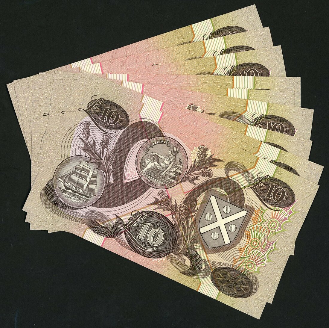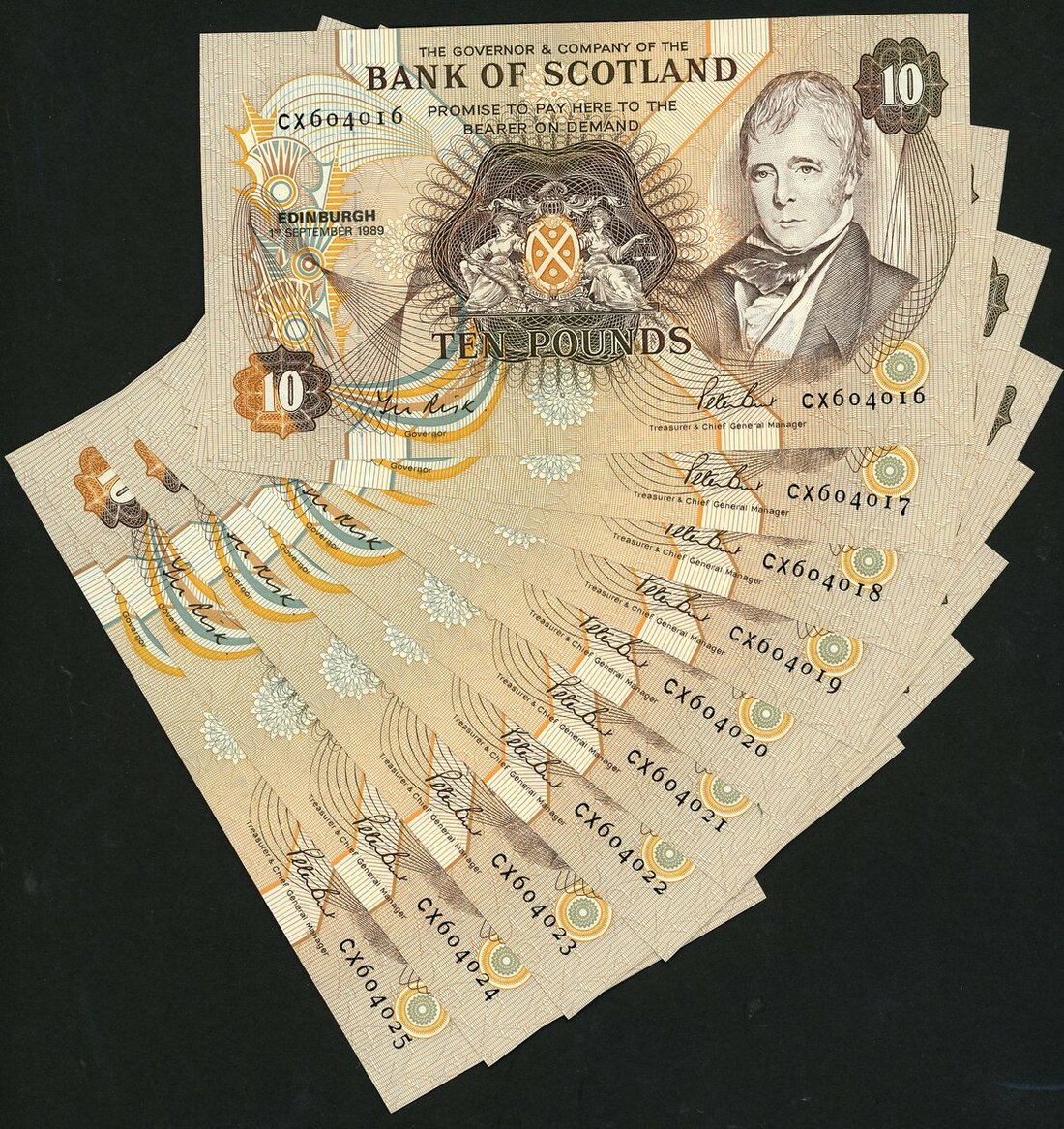 Bank of Scotland, consecutive £10 (10), 1 September 1989, serial numbers CX 604016-25, (PMS BA116d), CX first prefix of the series bearing Governor Sir Thomas Risk's signature, series starts at 600001. Minor handling, about uncirculated (10 notes) with memo from cashier presenting the notes to Sir Risk.