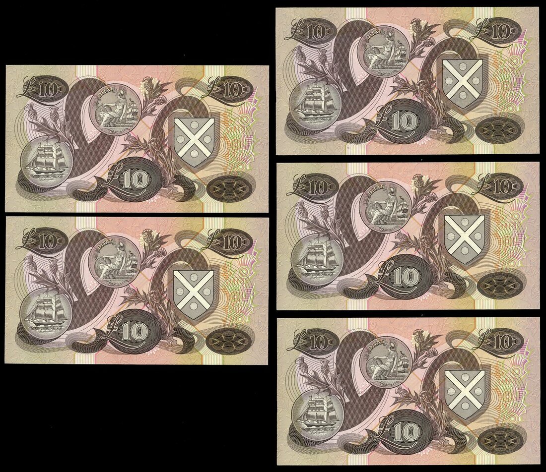Bank of Scotland, consecutive £5 (5), 31 October 1990, serial numbers EP 999996-1000000, (PMS BA116d), last 5 notes bearing Governor Sir Thomas Risk in the series, minor handling, about uncirculated, scarce (5 notes) Includes a memo from the cashier presenting the notes to Sir Risk.