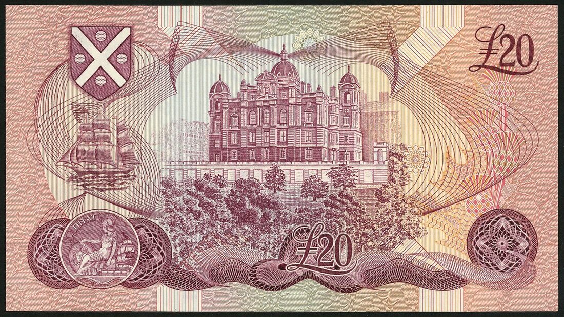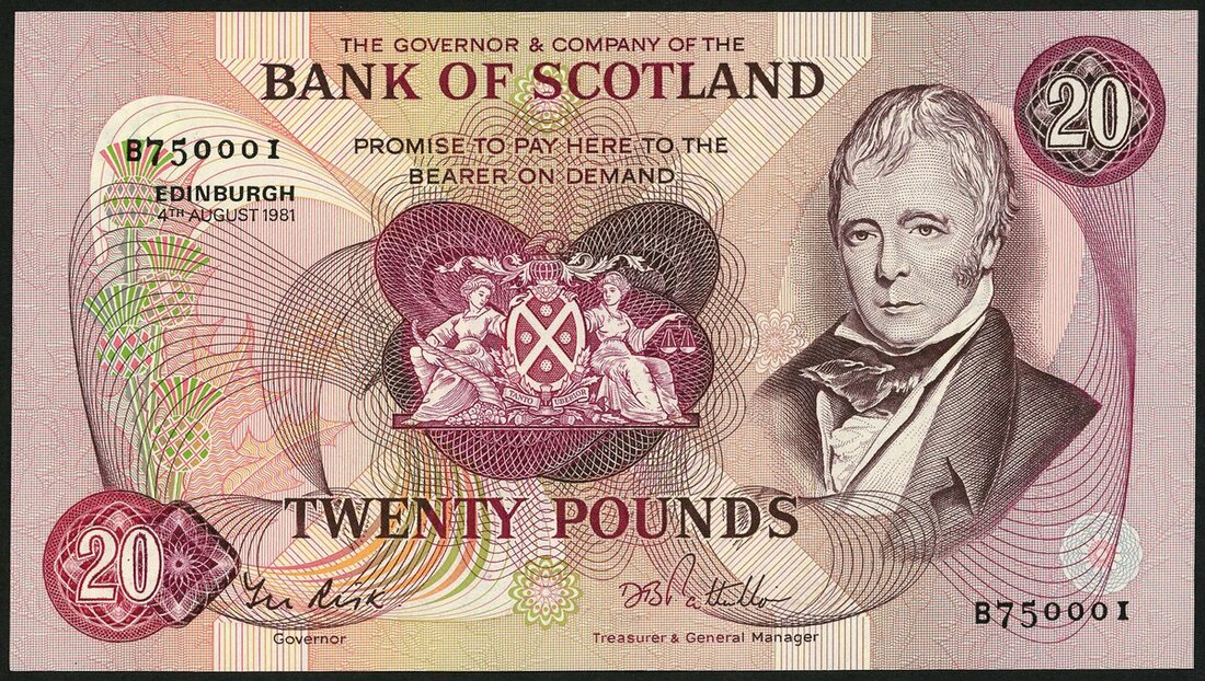 Bank of Scotland, £20, 4 August 1981, serial number B 750001, (PMS BA118e), First note of the £20 series bearing the signature of Governor Sir Thomas Risk. Minor handling, about uncirculated, scarce
