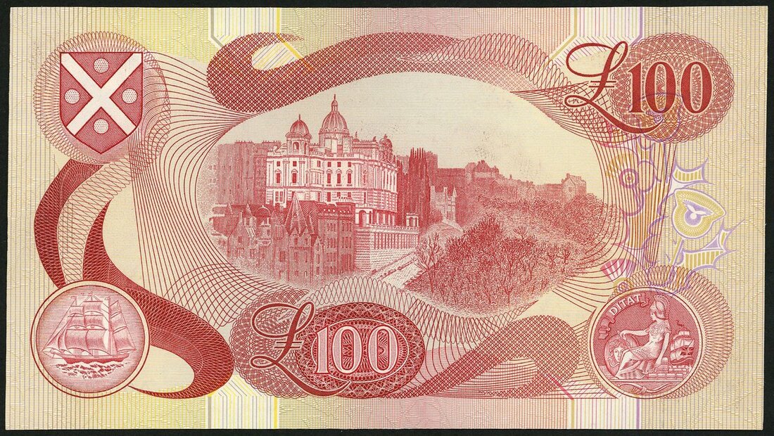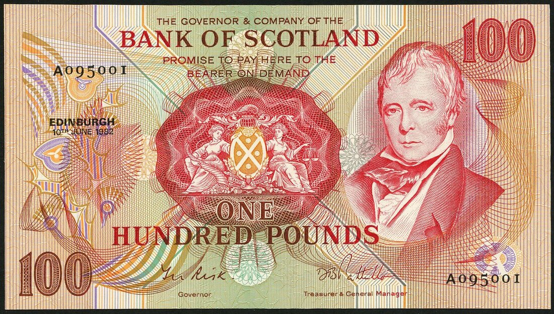 Bank of Scotland, £100, 10 June 1982, serial number A 095001, (PMS BA120e), First note of the £100 series bearing Governor Sir Thomas Risk's signature. Minor handling, about uncirculated. Number 1 note!