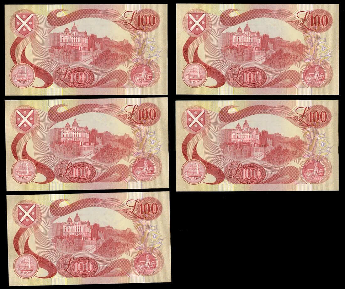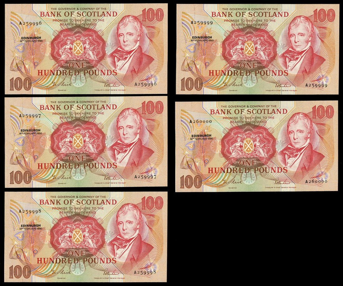 Bank of Scotland, consecutive £100 (5), 14 February 1990, serial numbers A 259996-260000, (PMS BA120e), last five £100 notes from the series bearing Governor Sir Thomas Risk's signature. Minor handling, about uncirculated. Scarce high serial number run, with memo from cashier presenting the notes to Sir Risk (5 notes)
