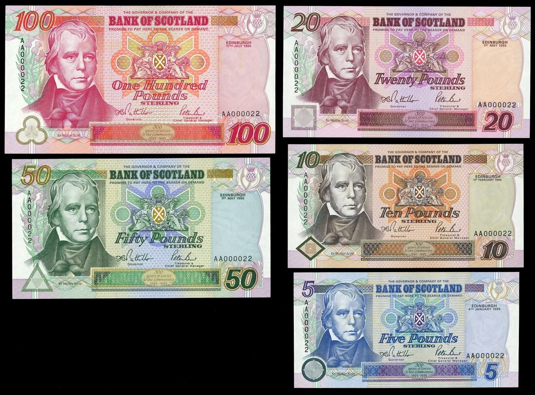 Bank of Scotland a set of 1995 issues with serial number AA 000022, including £5, £10, £20, £50 and £100, PMS BA122a, 123a, 124a, 125a, 126a, Pick 119a-123a), uncirculated, scarce low number set (From a private collection of Sir Thomas Risk) (5 notes)