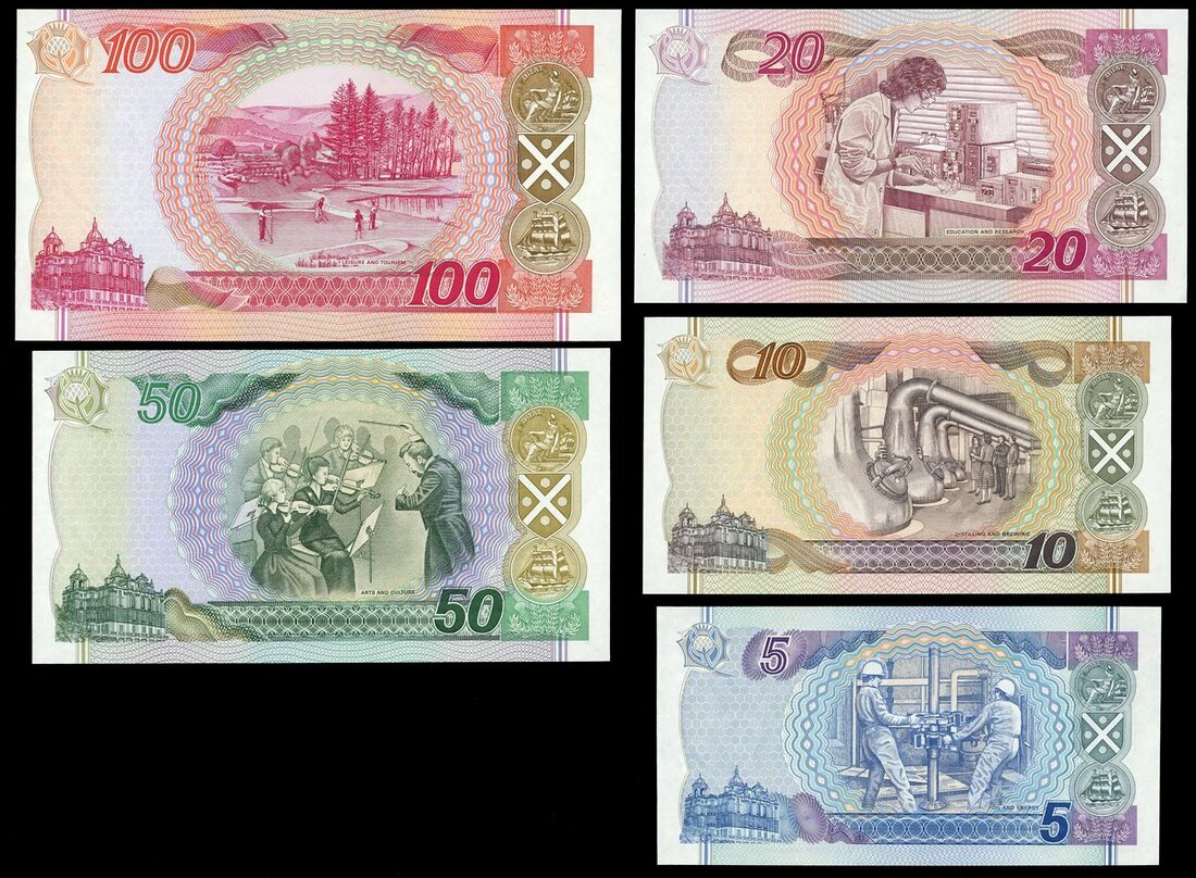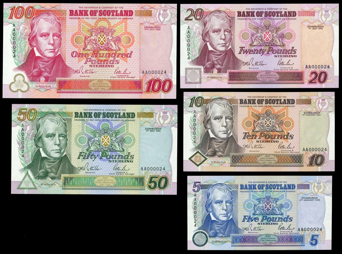 Bank of Scotland a set of 1995 issues with serial number AA 000024, including £5, £10, £20, £50 and £100, PMS BA122a, 123a, 124a, 125a, 126a, Pick 119a-123a), uncirculated, scarce low number set (From a private collection of Sir Thomas Risk) (5 notes)