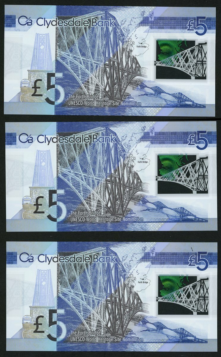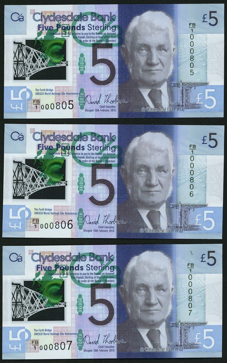 Clydesdale Bank, Scotland, consecutive £5 (3), 2015, serial numbers FB/1 000805/806/807, (PMS CL69), first prefix consecutive trio (3 notes)