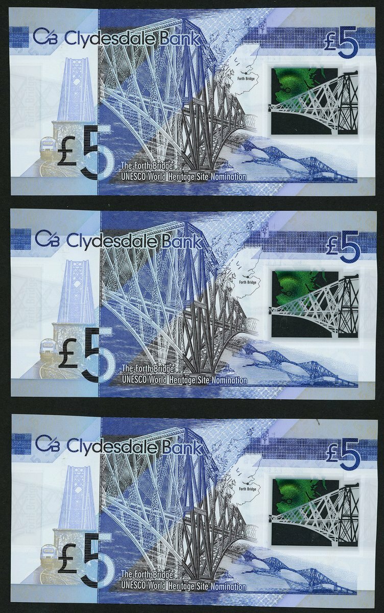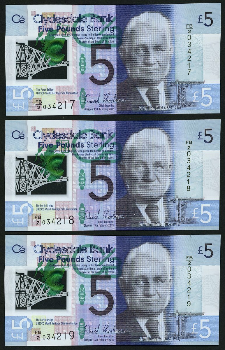 Clydesdale Bank, consecutive error £5 (3), 2015, serial number FB/2 034217/18/19, (PMS CL69), uncirculated (3 notes)