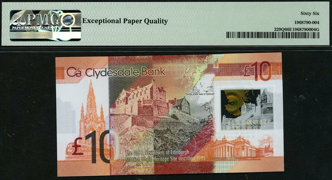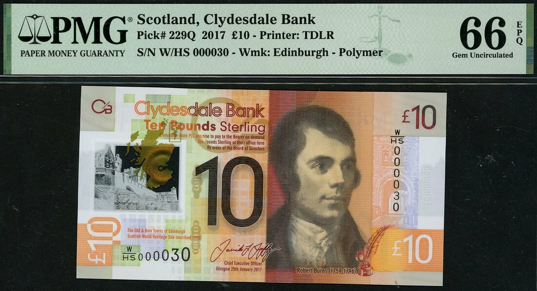 Clydesdale Bank, £10, 25 January 2017, serial number W/HS 000030, (PMS CL71a, Pick 229Q), in PMG holder 66 EPQ Gem Uncirculated, low number
