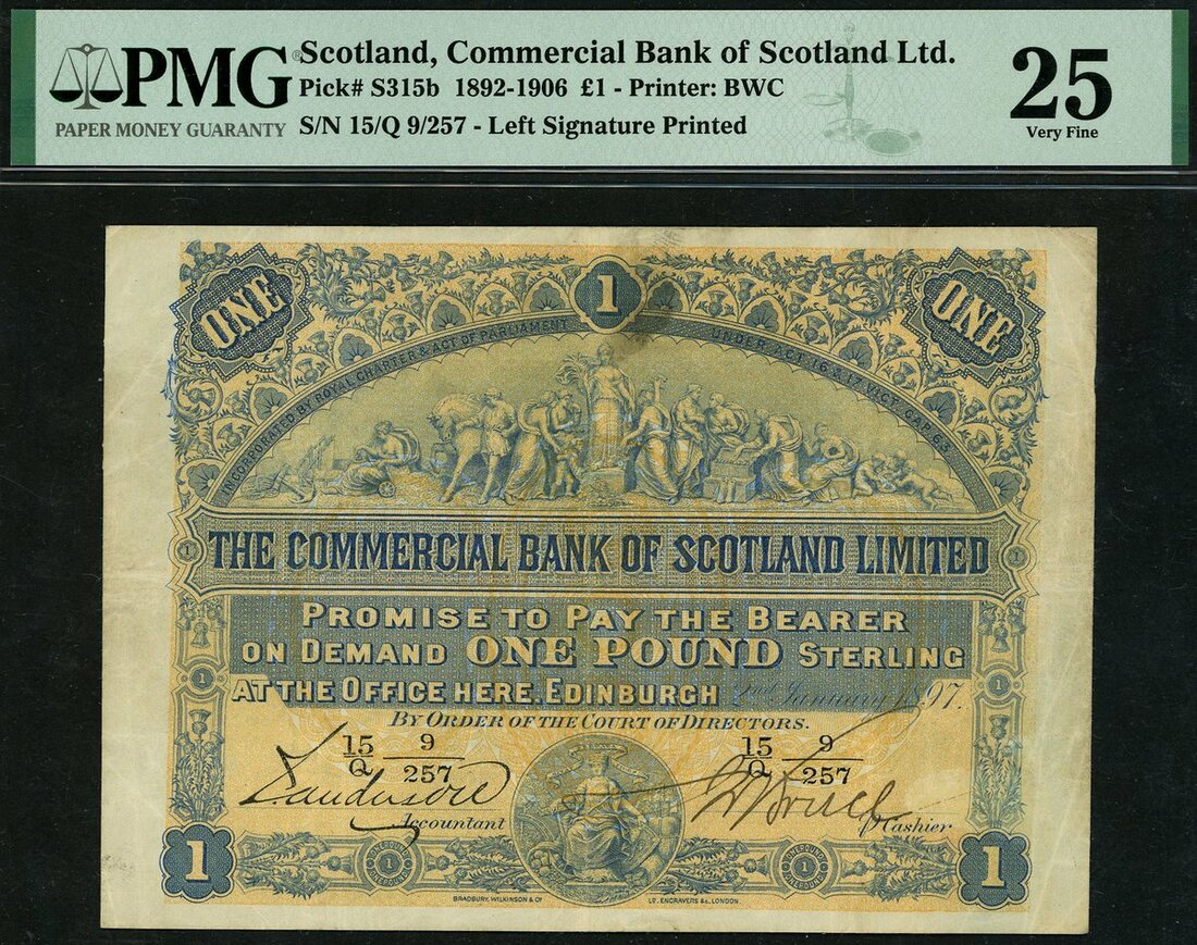 (x) Commercial Bank of Scotland Limited, £1, 2 January 1897, serial number 15/Q 9/257, blue on yellow underprint, ornate frieze surrounded by thistles at top centre, bank emblem at low centre, signatures of Anderson and Bruce, reverse green, bank building at centre