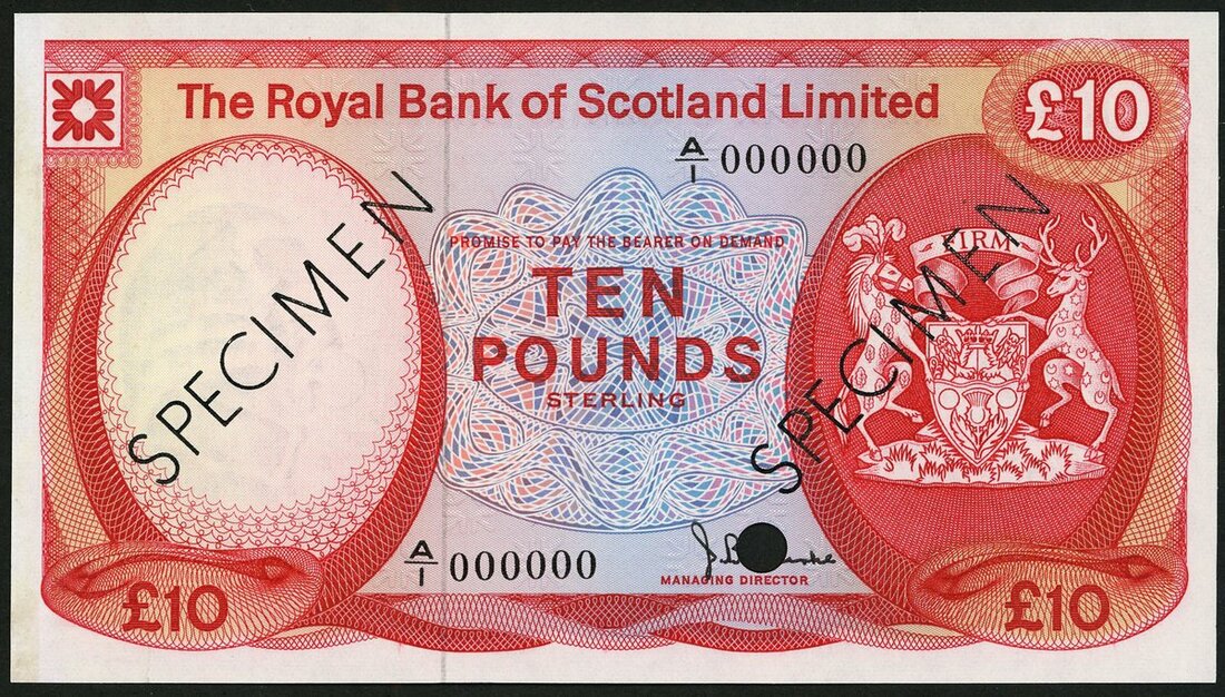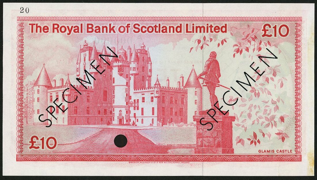 (x) The Royal Bank of Scotland Limited, colour trial £10, ND (1972), serial number A/1 000000, red, bank arms at right, Burke signature, reverse, Glamis Castle,