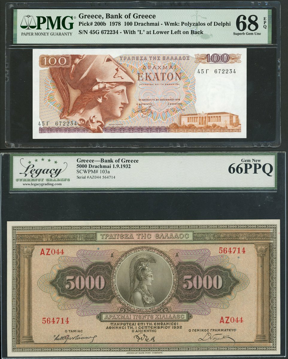 (x) Bank of Greece, 5000 drachmai, 1932, red prefix AZ, brown, Minerva at centre, also 100 drachmai, 1978, brown, Athena at left