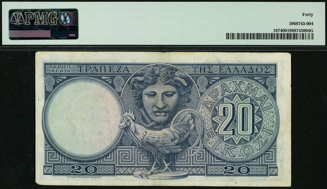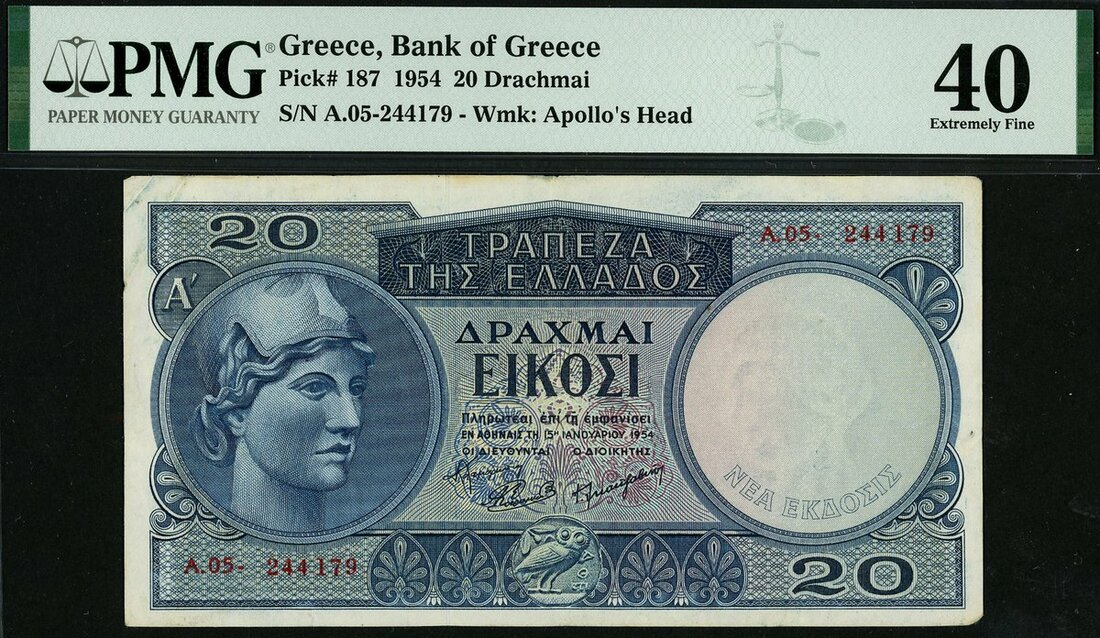 Bank of Greece, 20 drachmai, 1954, serial number A.05-244179, (Pick 187a), in PMG holder 40 Extremely Fine, short circulation issue.