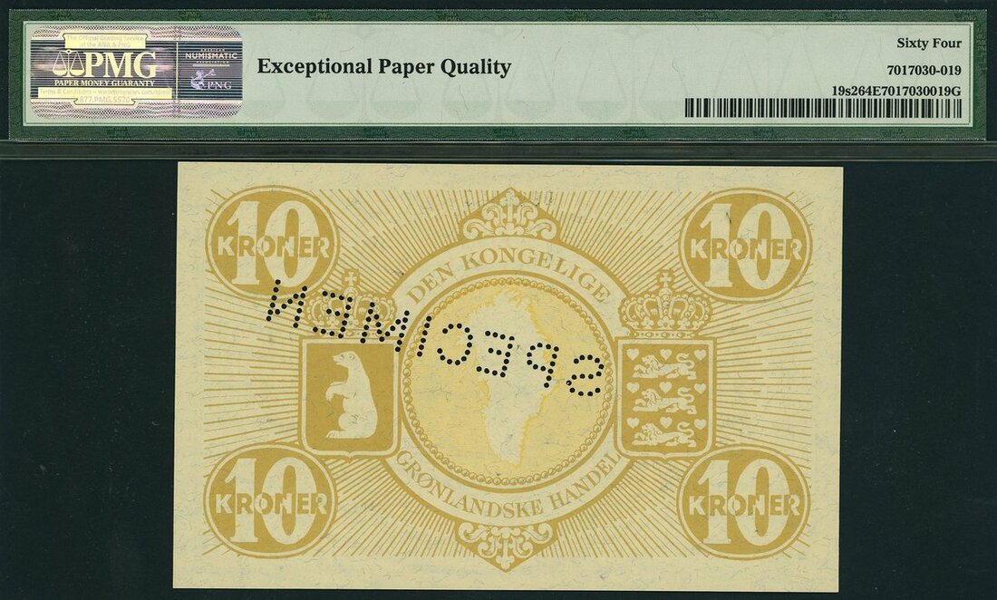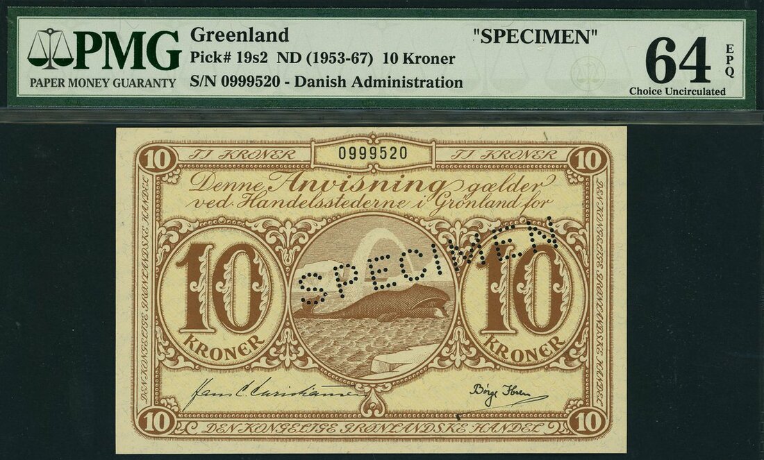 Greenland / Danish Administration, specimen 10 kroner, ND (1953-67), serial number 0999520, (Pick 19s2), in PMG 64 EPQ Choice Uncirculated