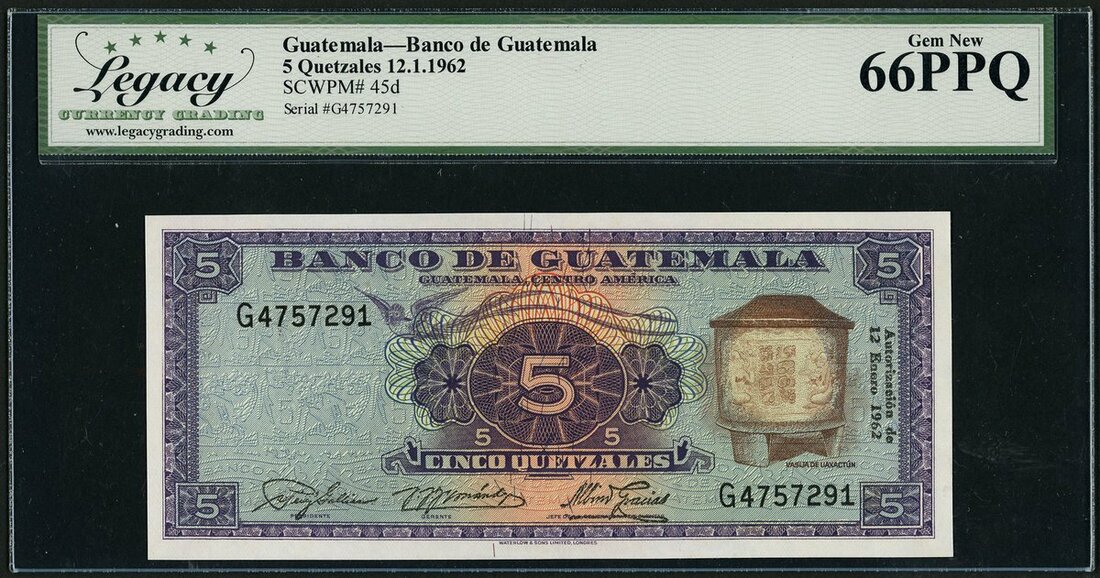 (x) Banco de Guatemala, 5 quetzales, 1962, serial number G 4757291, urn at right