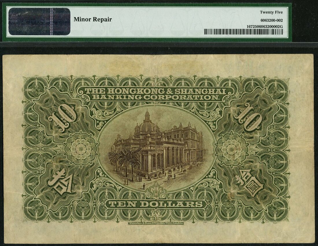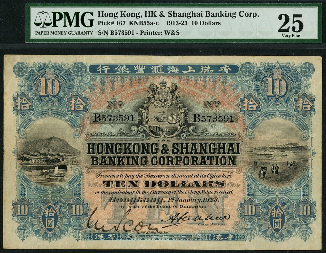 (x) Hong Kong & Shanghai Banking Corporation, $10, 1st January 1923, serial number B573591, (Pick 167), in PMG holder 25 Very Fine, minor repair, example of an icon HSBC series, beautiful and scarce