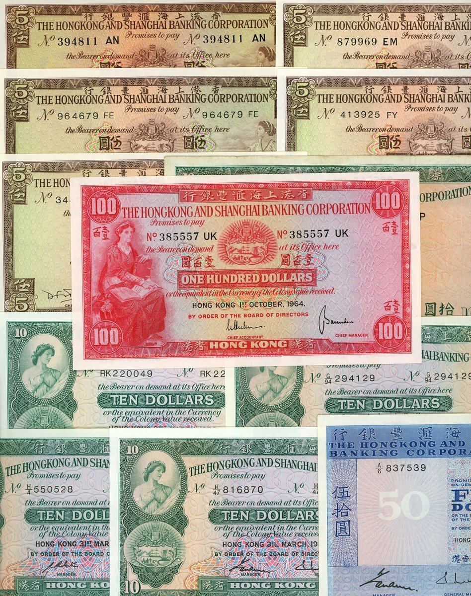 Hong Kong and Shanghai Banking Corporation, $5 (6), 1960, 1964, 1972, 1973, 1975 (2), brown, $10 (9), 1966, 1968, 1972, 1976, 1977, 1978, 1981, 1982, 1983, green, $50, 1983, $100, 1964, suffix UK, red