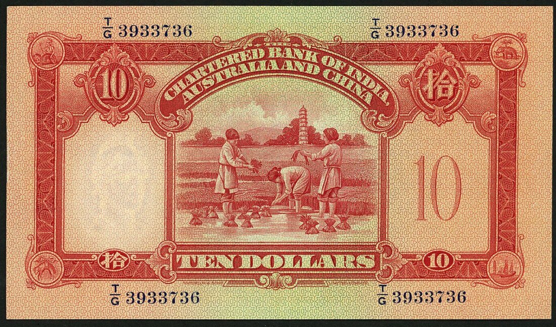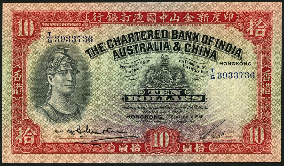 Chartered Bank of India, Australia and China, Hong Kong, $10, 1 September 1956, serial number T/G 3933736, red and pale green, helmeted classical male head at left, arms right centre, printed signatures low centre, reverse red, rice harvesting scene at centre