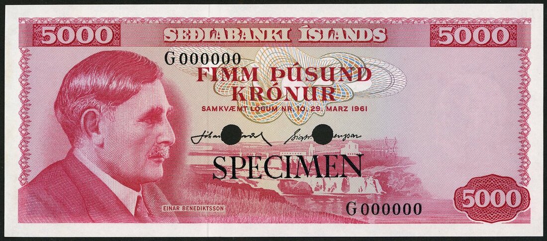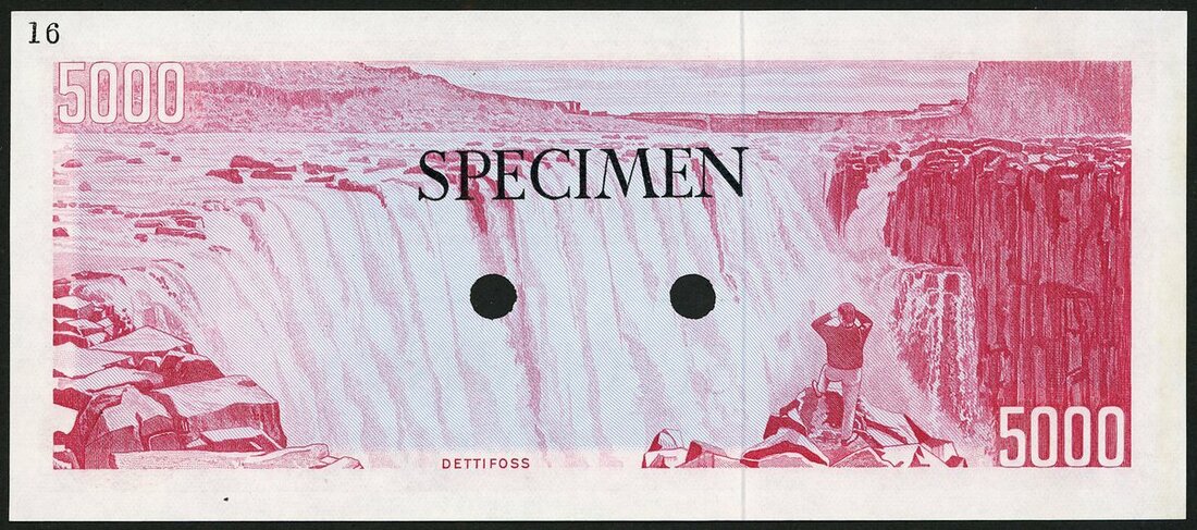(x) Sedlabanki Islands, Iceland, colour trial specimen 5000 kronur, 1961, red, Einar Benediktsson at left, reverse red, Detifoss falls