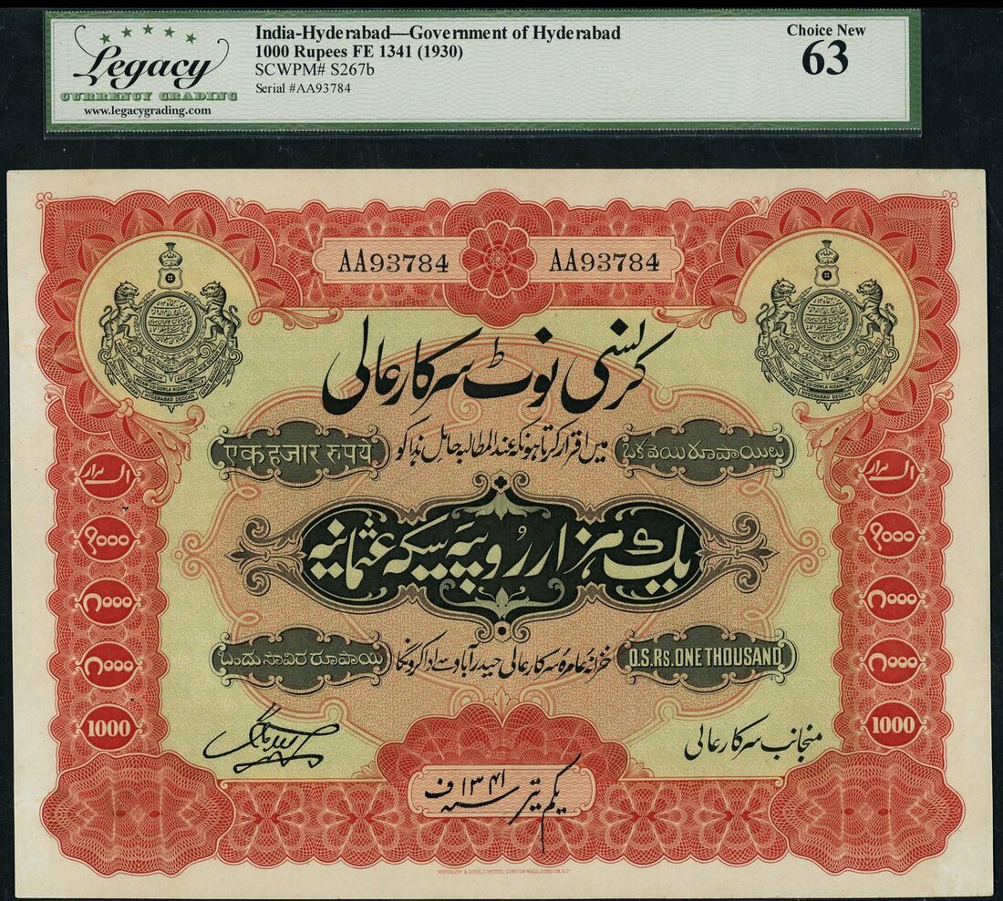 (x) Hyderabad, Government issue, India, 1000 rupees, FE 1341 (1941), serial number AA 93784, red and pale green and tan, arms top left and right, Hyder Nawaz Jung signature, reverse red, value at centre and at each corner