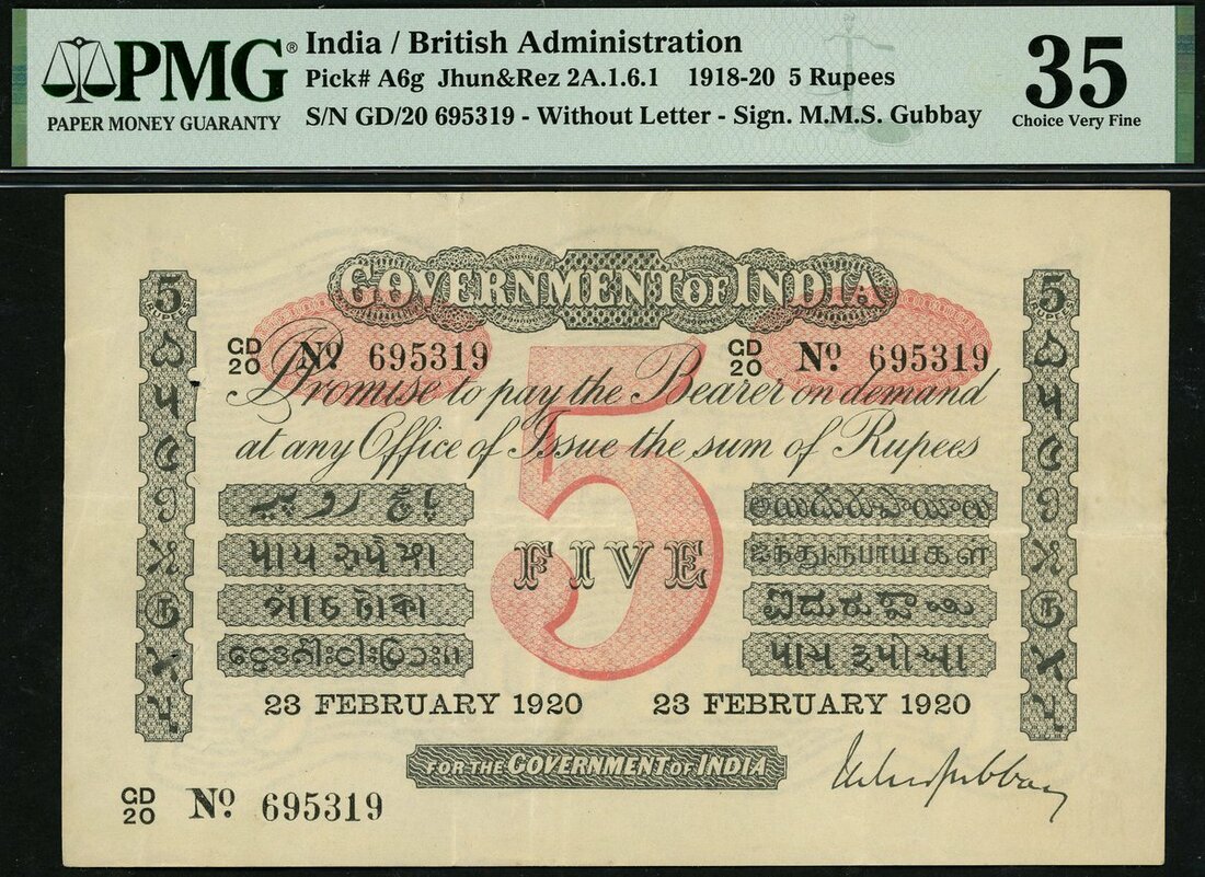 Government of India, 5 rupees, no place name, 23 February 1920, serial number GD/20 69539, black and white, value in red-pink at centre and a red-pink guilloche top left and right, M.M.S.Gubbay signature low right
