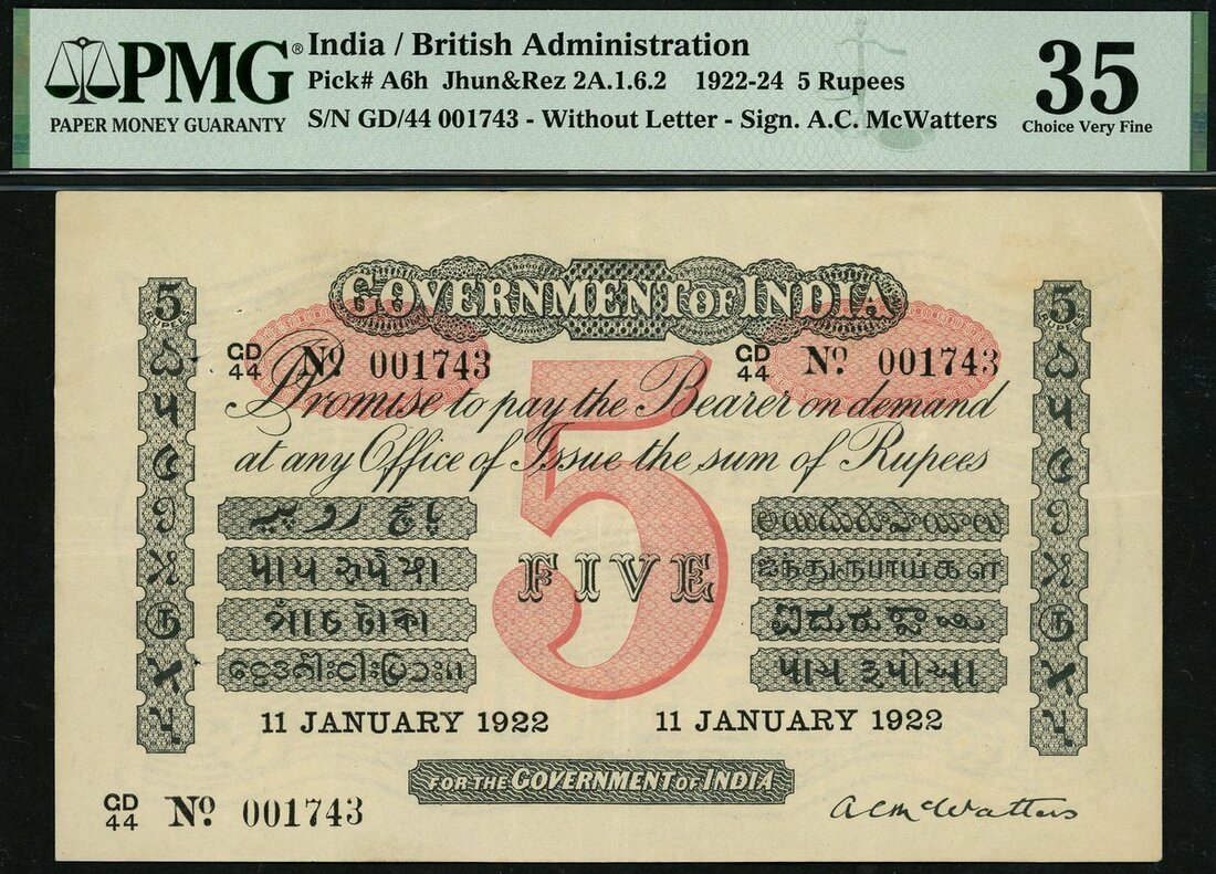 Government of India, 5 rupees, no place name, 11 January 1922, serial number GD/44 001743, black and white, value in red-pink at centre and a red-pink guilloche top left and right, A.C.McWatters signature low right