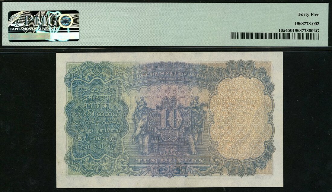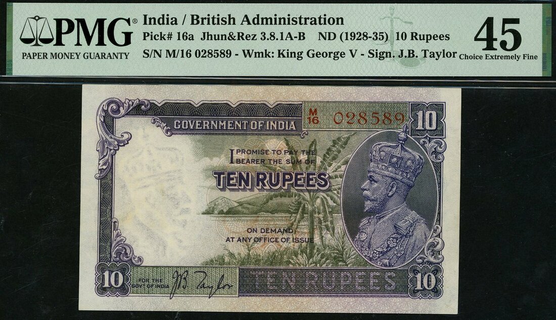 Government of India, 10 rupees, ND (1928-35), serial number M/16 028589, (Pick 16a, Razack-Jhunjhunwalla 3.8.1A-B), in PMG holder 45 Choice Extremely Fine
