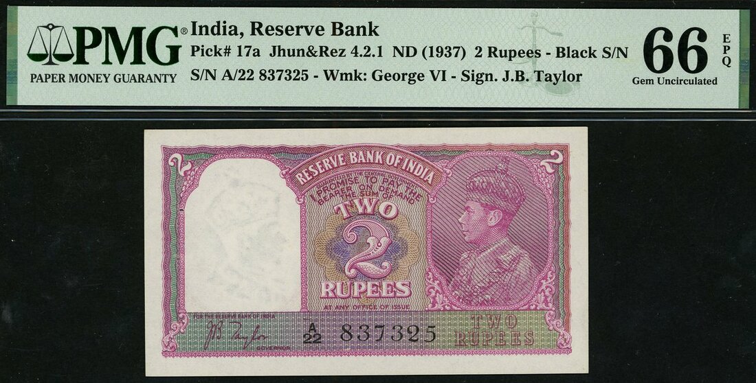 Reserve Bank of India, 2 rupees, ND (1937), serial number A/22 837325, lilac, George VI at right, Taylor signature