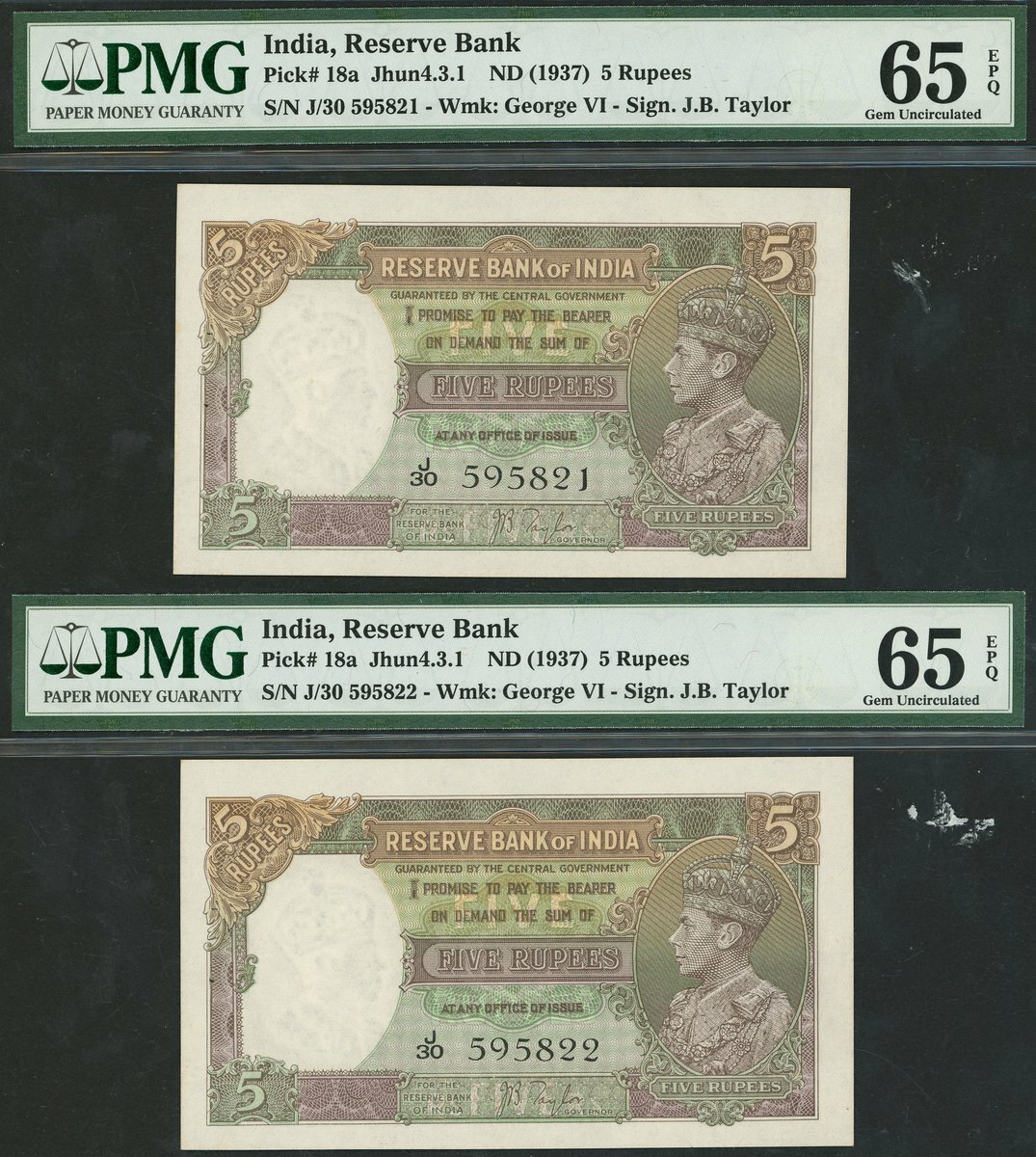 (x) Reserve Bank of India, 5 rupees (2), ND (1937), consecutive serial numbers J/30 595821/822, brown and green, George VI at right, value at each corner