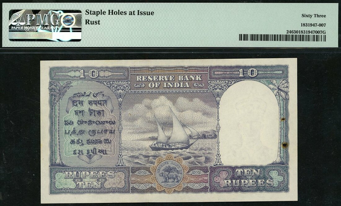 (x) Reserve Bank of India, 10 rupees, ND (1943), serial number G/17 090870, (Pick 24, TBB B208), in PMG holder, staple holes at issue, rust, 63 Choice About Uncirculated