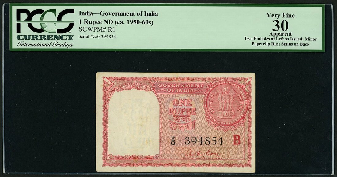Government of India, Persian Gulf issue, 1 rupee, ND (c1950), serial number Z/0 394854, (Pick R1), pinholes at left, paperclip rust stains at reverse, in PCGS holder number 30 apparent, original very fine