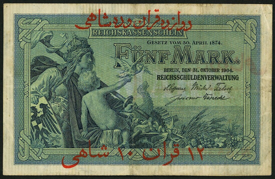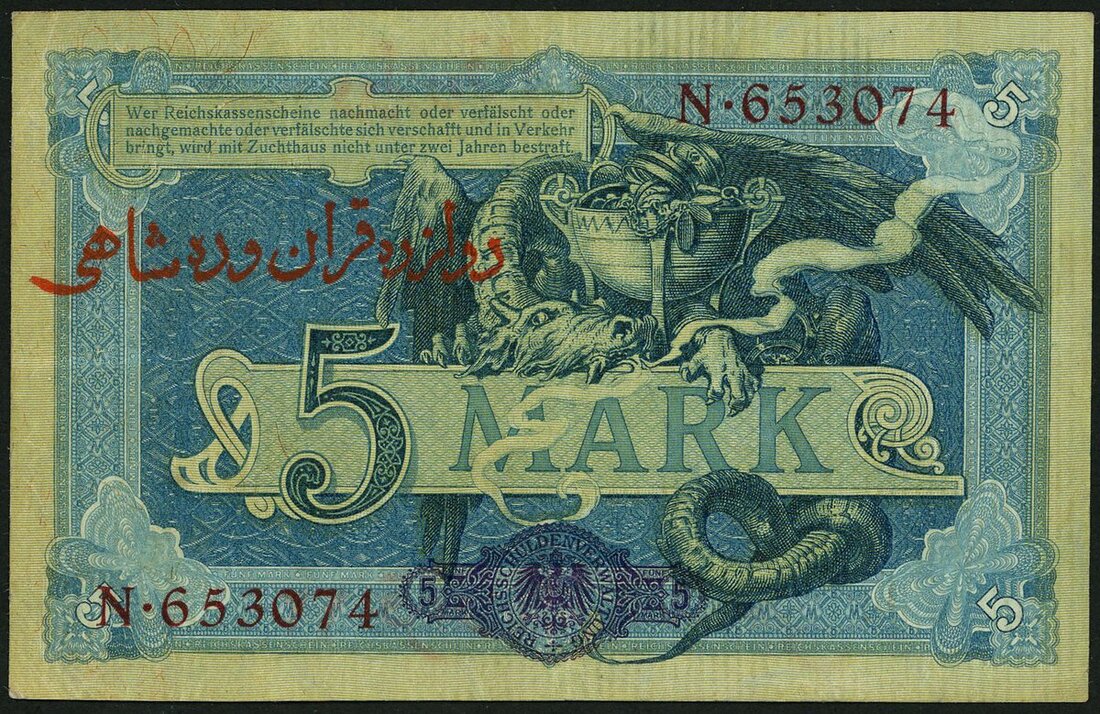 German treasury for use in Iran during World War I, 12 Qiran (kran) 10 shahi red Farsi overprint on 5 marks, ND (1916-1917), serial number 5653074, blue, Germania and child at left, reverse blue, red Farsi overprint