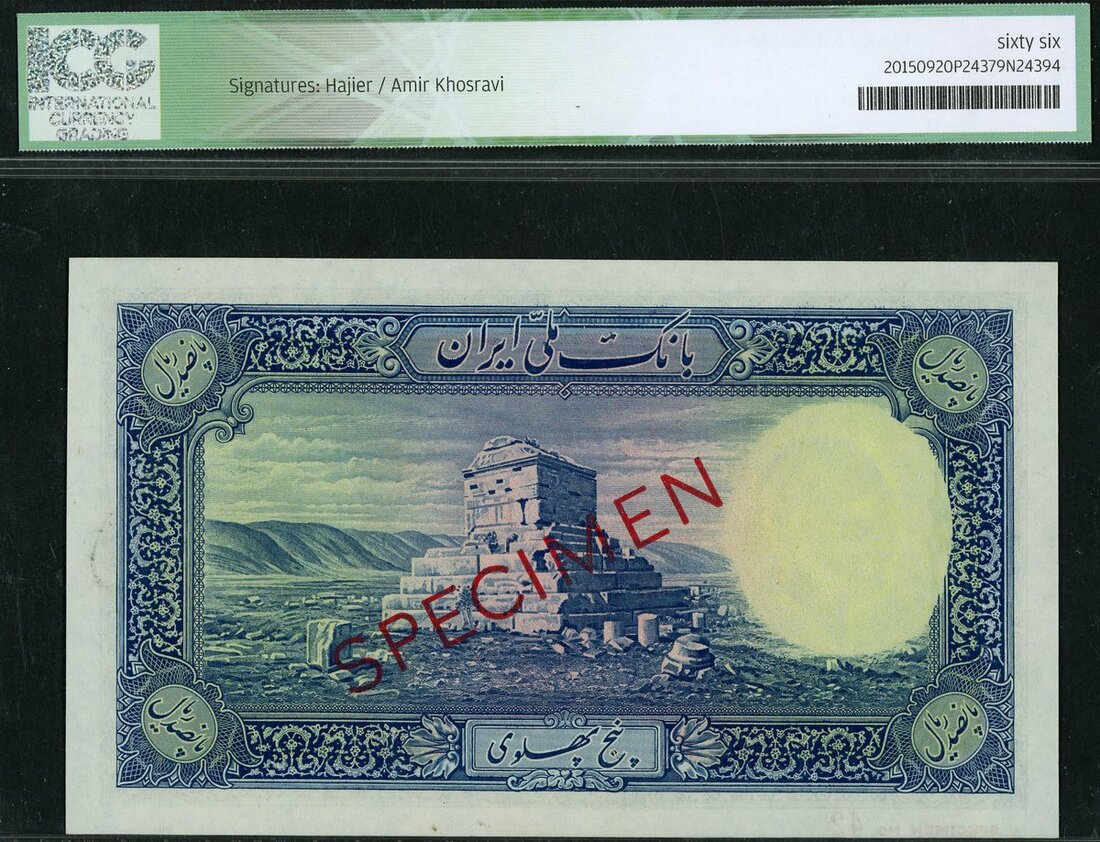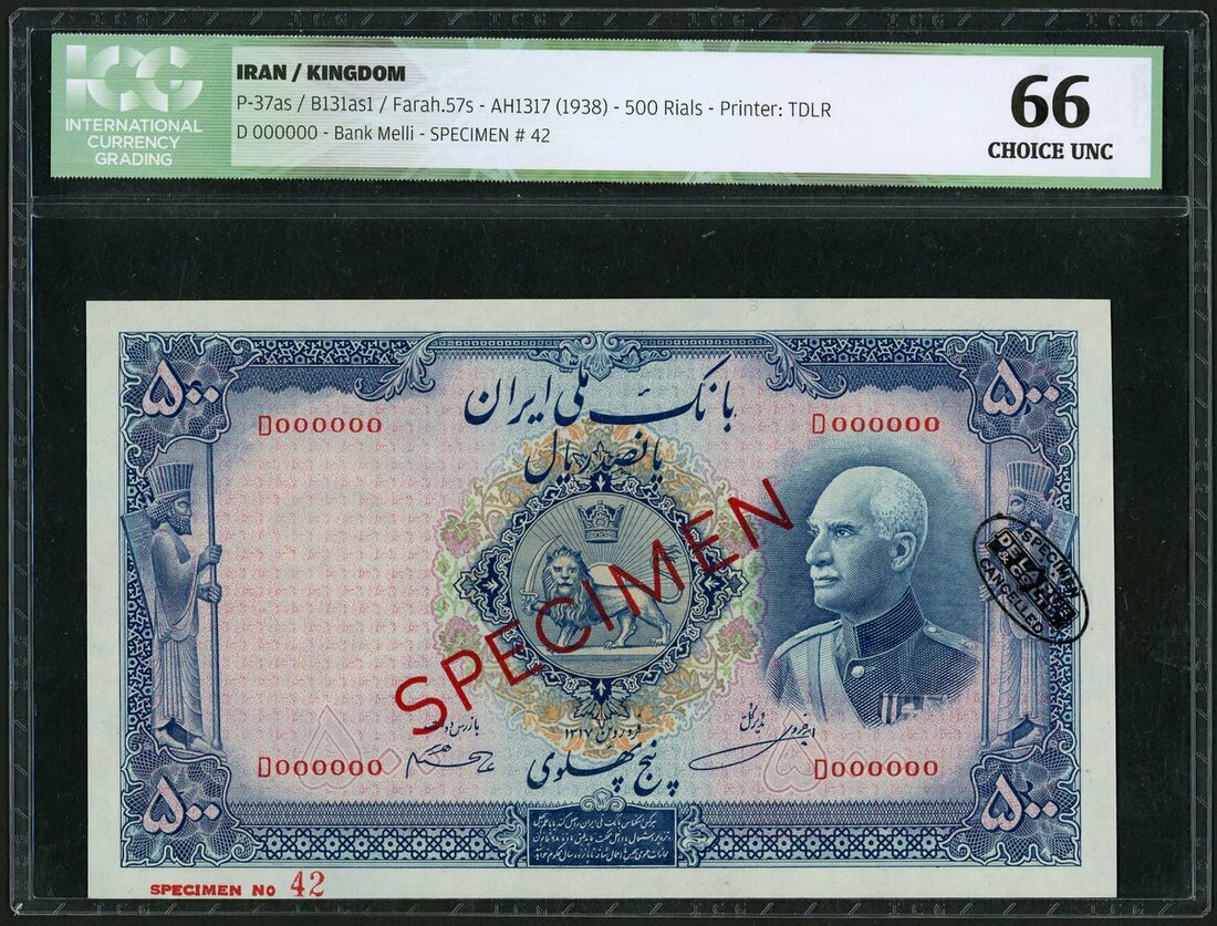 (x) Bank Melli Iran, specimen 500 rials, AH 1317 (1938), serial number in red D 000000, blue and multicoloured, Shah Reza at right, arms at centre, an Immortal at left, signature of Hajier and A. Khosravi, reverse blue, the Tomb of Cyrus the Great at centre