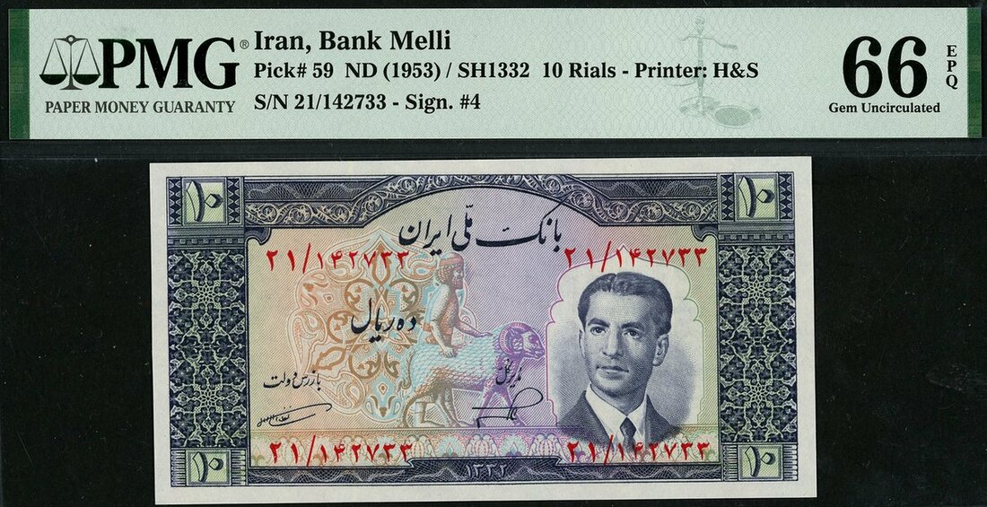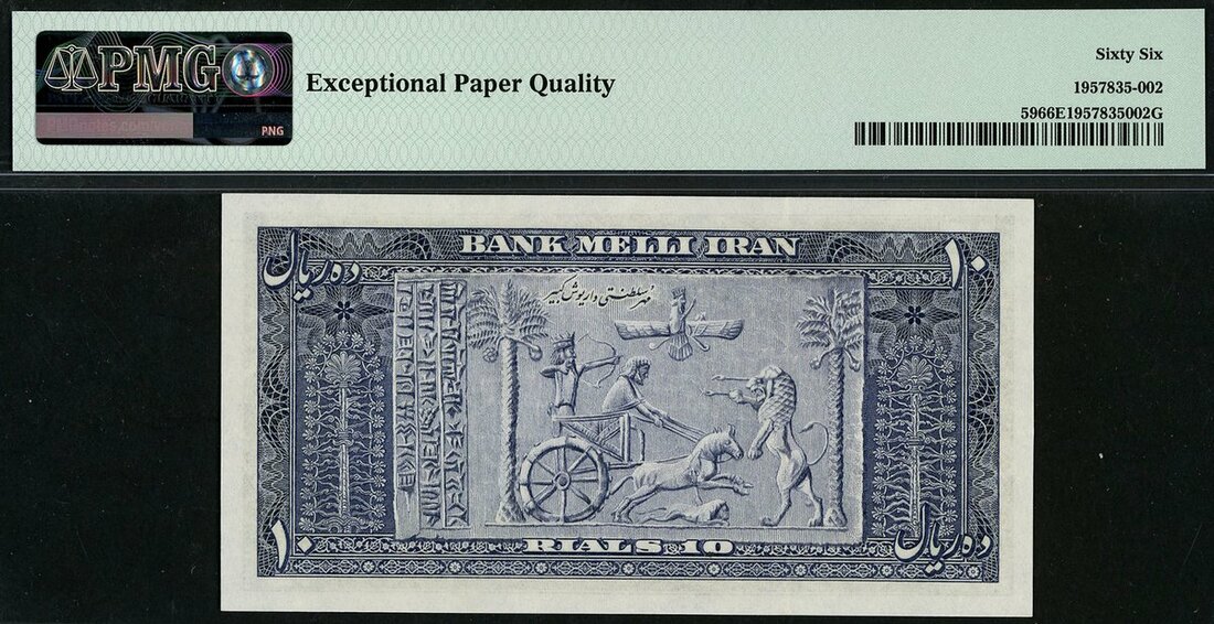 (x) Bank Melli Iran, 10 rials, ND (1953), (Pick 59), in PMG holder 66 EPQ Gem Uncirculated. ''This lot is subject to import restrictions into certain countries. Please enquire with us before buying.''