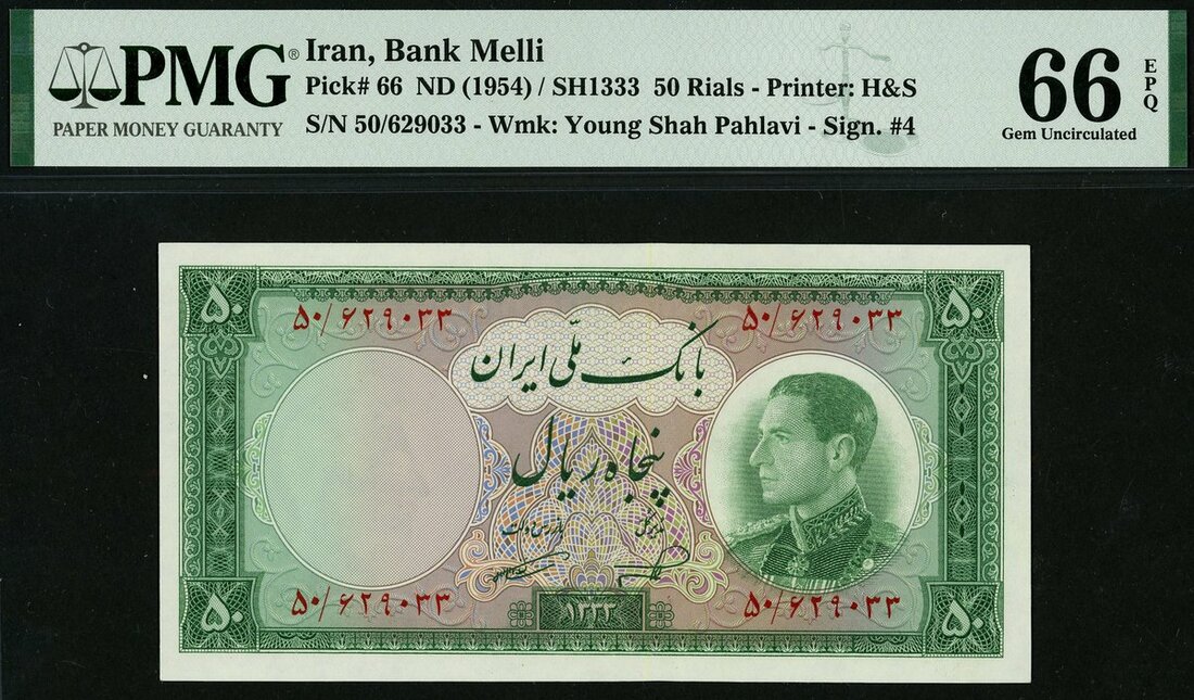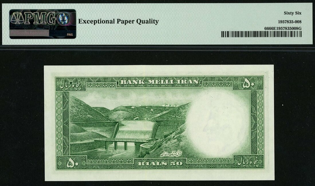 (x) Bank Melli Iran, 50 rials, ND (1954), (Pick 66), in PMG holder 66 EPQ Gem Uncirculated. ''This lot is subject to import restrictions into certain countries. Please enquire with us before buying.''