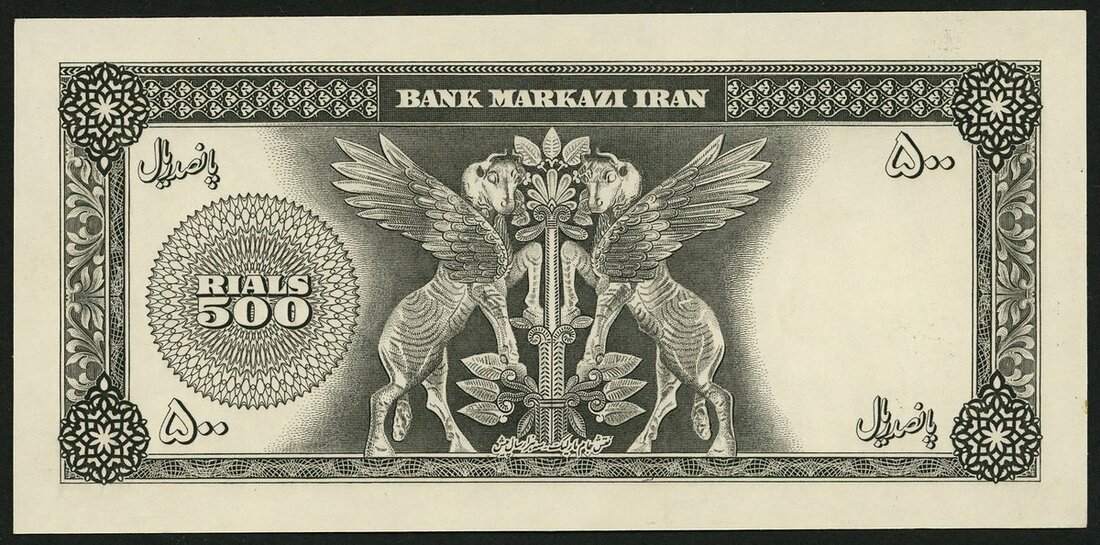 Bank Markazi Iran, a reverse proof for a 500 rials, ND (ca 1965), black and white, winged bulls at centre