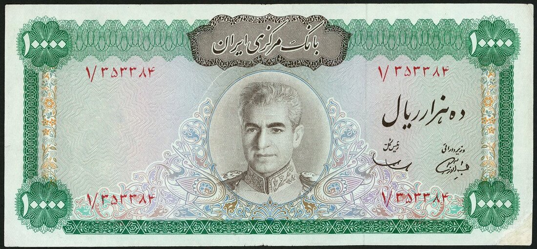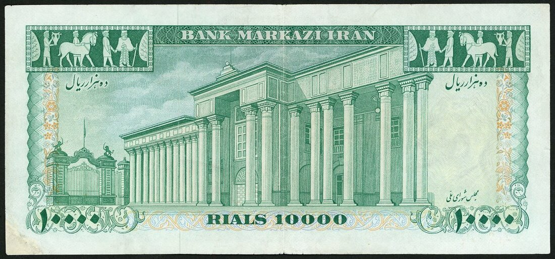 Bank Markazi Iran, 10000 rials, 1971, red serial numbers, green and pink and blue, Shah Pahlavi at centre, signatures of Samil and Amoozgar, reverse green, the National Assembly building at centre