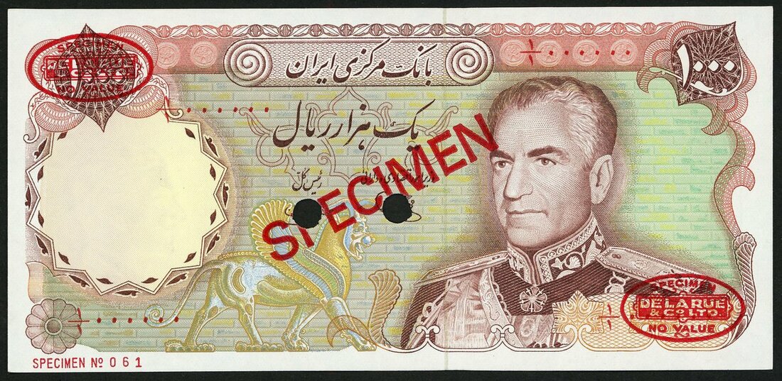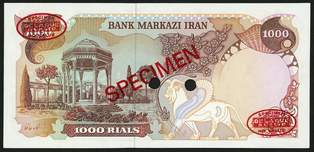 Bank Markazi Iran, specimen 1000 rials, ND (1974-), brown, pink and multicoloured, Shah Pahlavi at right, reverse the Tomb of Hafez in Shiraz at centre