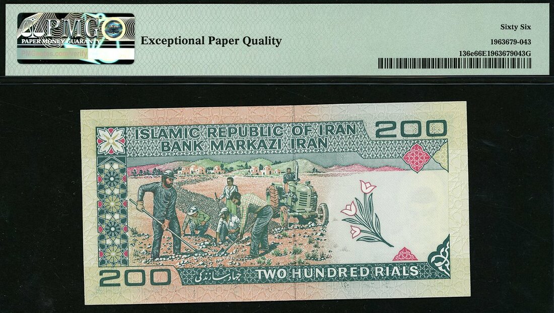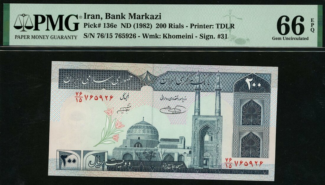 (x) Bank Markazi Iran, 200 rials, ND (1982), (Pick 136), in PMG holder 66 EPQ Gem Uncirculated. ''This lot is subject to import restrictions into certain countries. Please enquire with us before buying.''