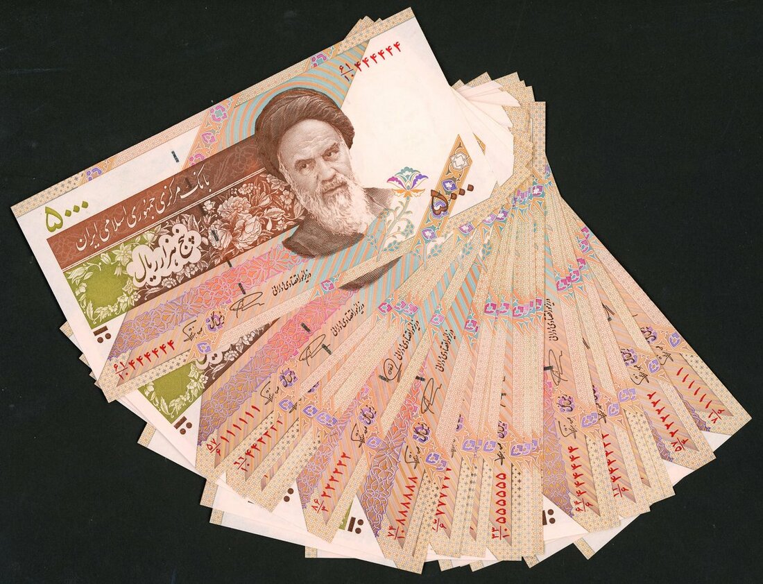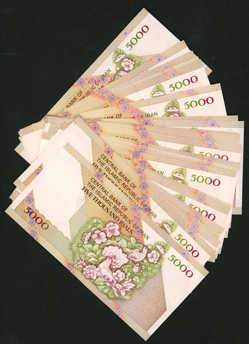 Central Bank of the Islamic Republic of Iran, 5000 rials (24), ND (1994), all with 'solid serial numbers', 111111 etc, pink, Ayatollah Khomeini at right, signatures of Moshen Nourbaksh and Mohammed Khan, reverse flowers and birds