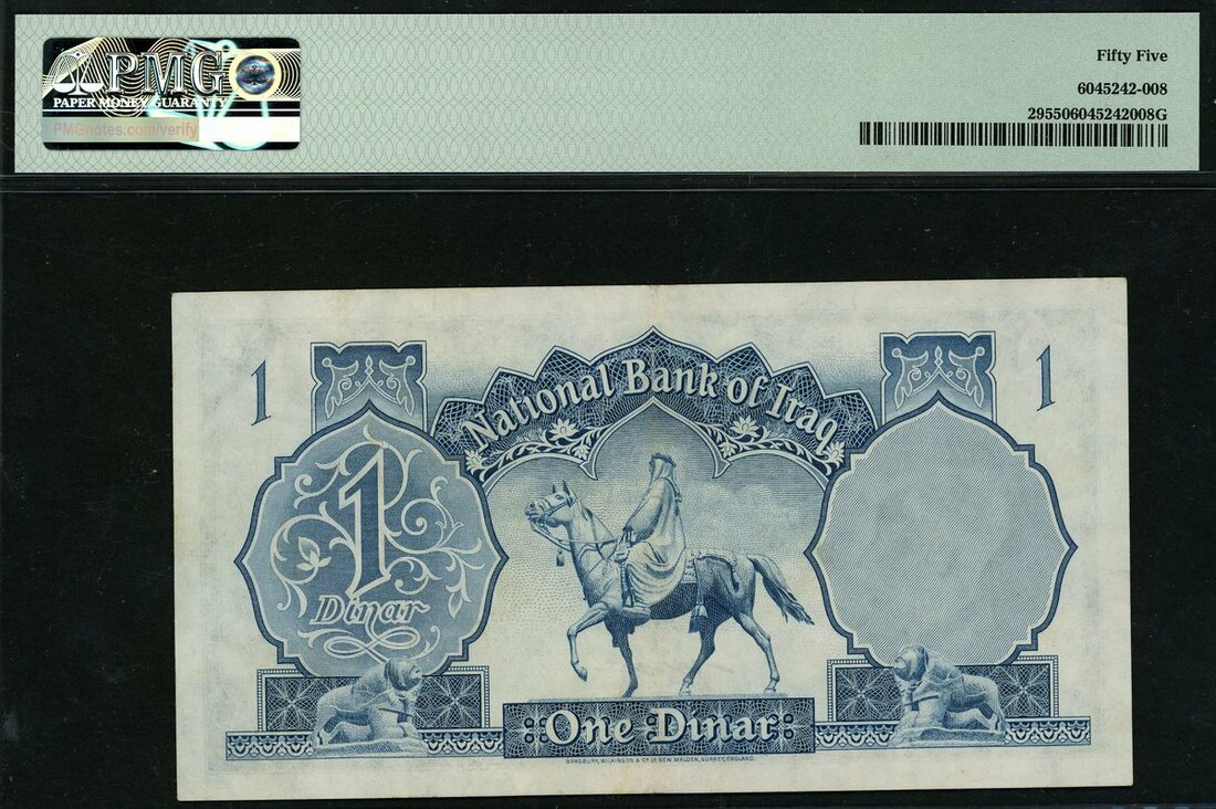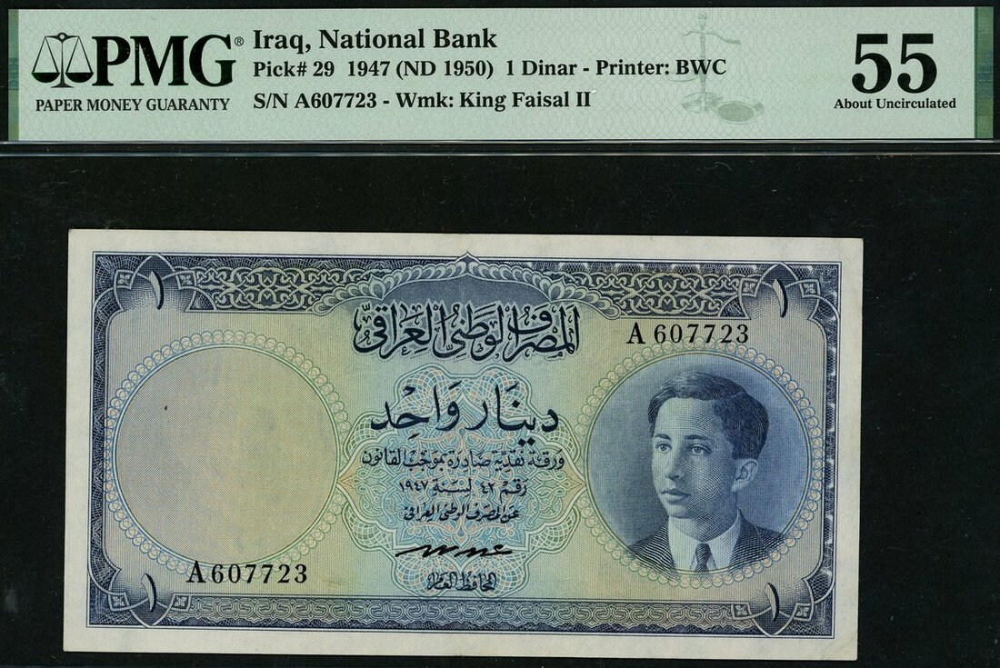 (x) National Bank of Iraq, 1 dinar, law of 1947 (1950), serial number A 607723, blue, pale green and pale orange, King Faisal II as a youth at right, signature of Abdul Ilah Hafudh low centre, reverse blue, statue of King Faisal I on horseback at centre
