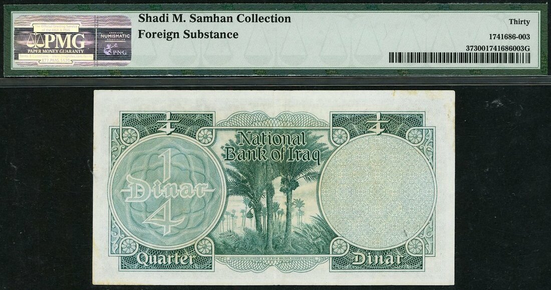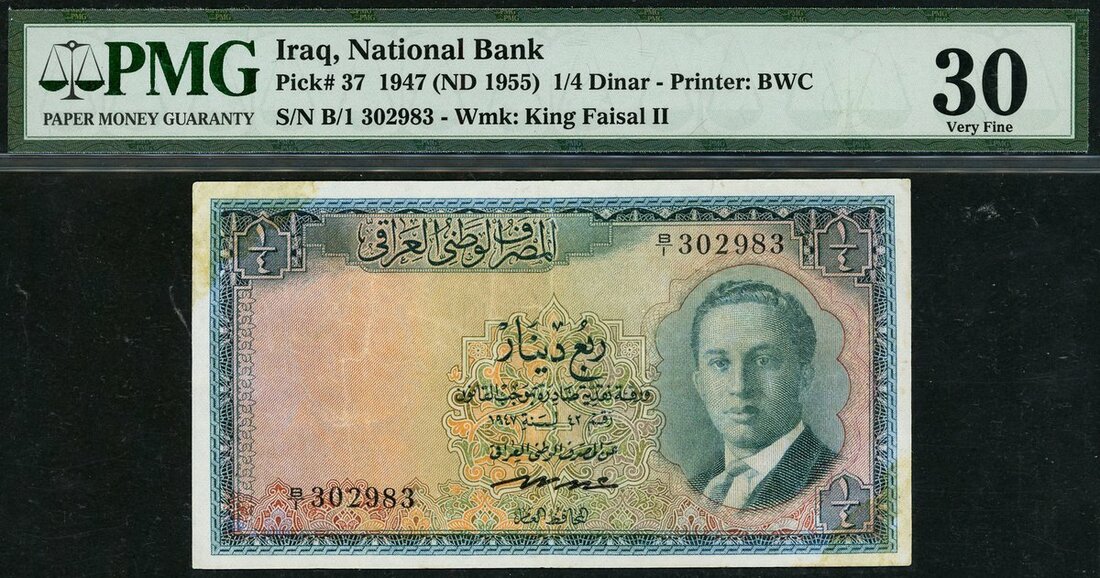 (x) National Bank of Iraq, third issue, 1/4 dinar, law of 1947 (1950), serial number B/1 302983, green and pale orange and lilac, King Faisal II as a young man at right, signature of Abdul Ilah Hafudh low centre, reverse green, palm trees, bank title and value