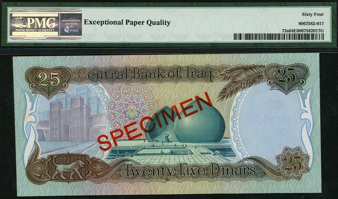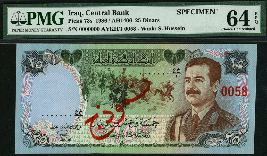 (x) Central Bank of Iraq, specimen 25 dinars, 1986, signature of Hikmat Mizban Ibrahim al-Azzawi,