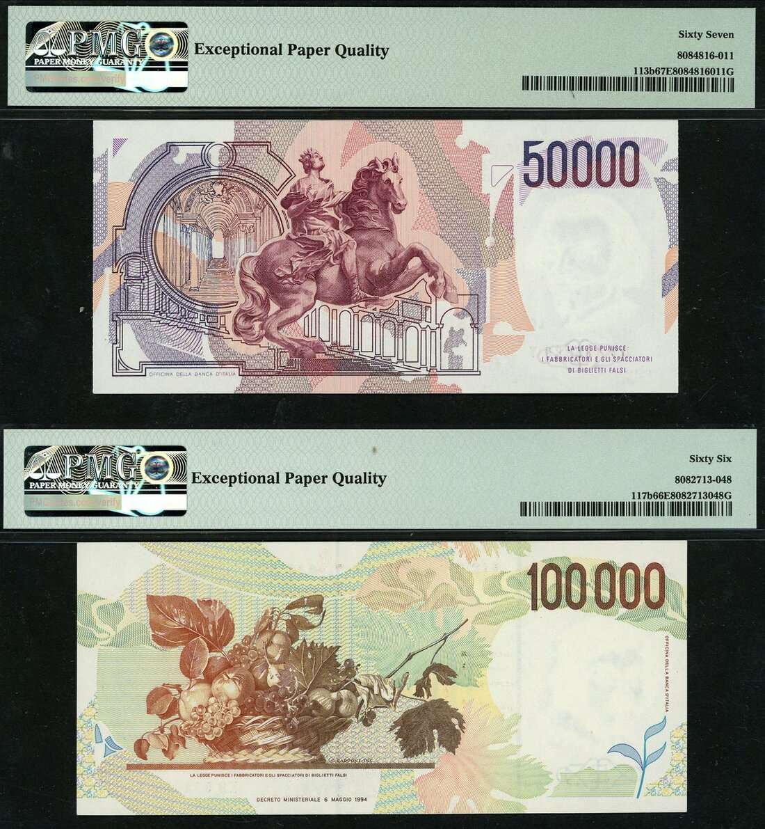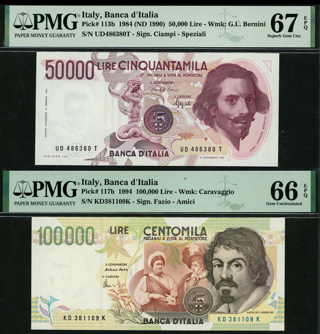 (x) Banca d'Italia, 50000 lire, 1984 (1990), prefix UD, purple, Bernini at right and a 100000 lire, 1994, prefix KD, green and multicoloured, Caravaggio at right