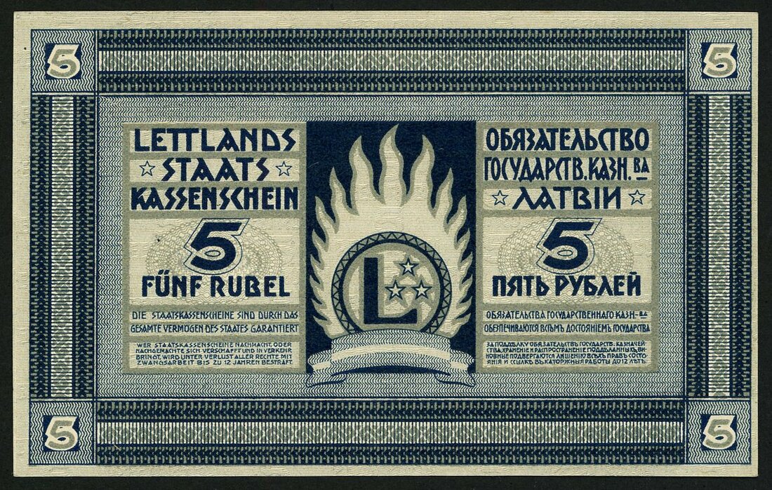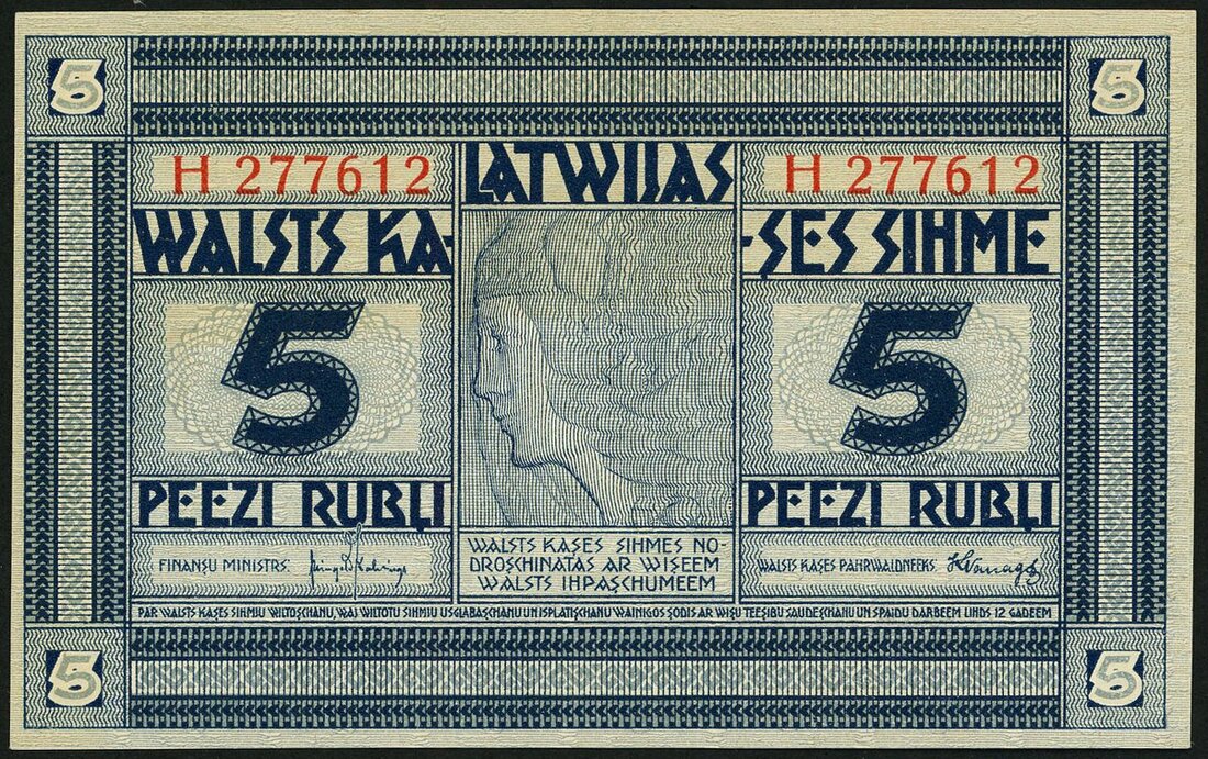(x) Latvia, 5 rubley, 1919, serial number H 277612, (Pick 3f, TBB B103f), slightly pressed, otherwise about uncirculated