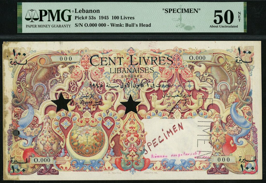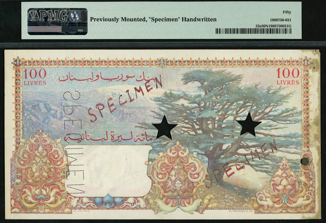 Banque de Syrie et du Liban, Lebanon, specimen 100 livres, 1945, zero serial numbers, red and multicoloured, ornate Arabesque design in field, value at each corner, Busson and Letayf signatures, reverse blue-green and multicoloured, Cedar tree at right, Mount Lebanon at left, value in red top left and right, stars perforated,