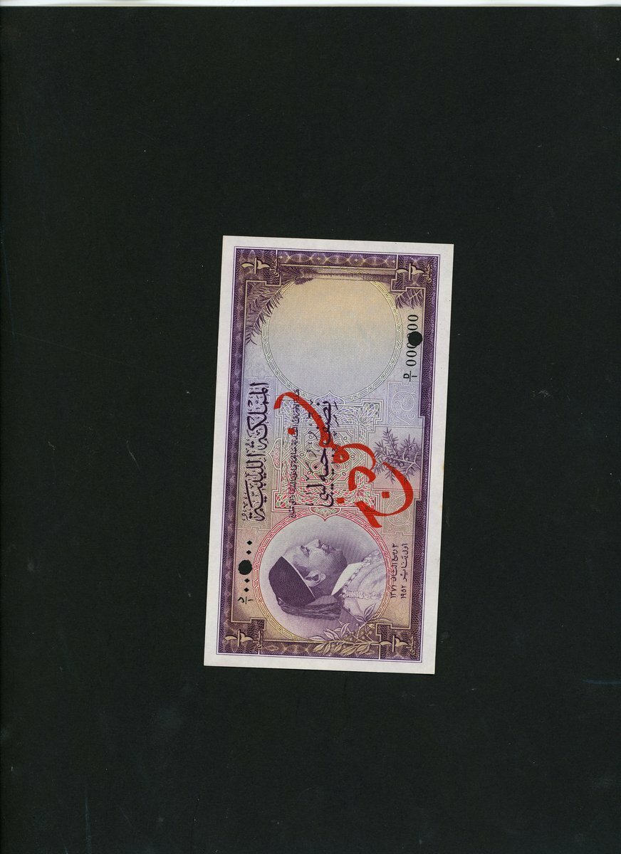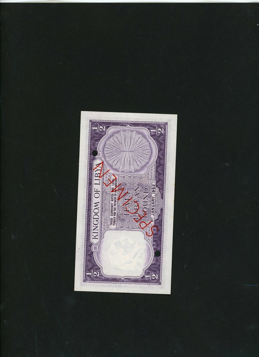 Kingdom of Libya, specimen 1/2 Libyan pound, 1952, serial number D/1 000000, purple, King Idris at left, bush low centre,