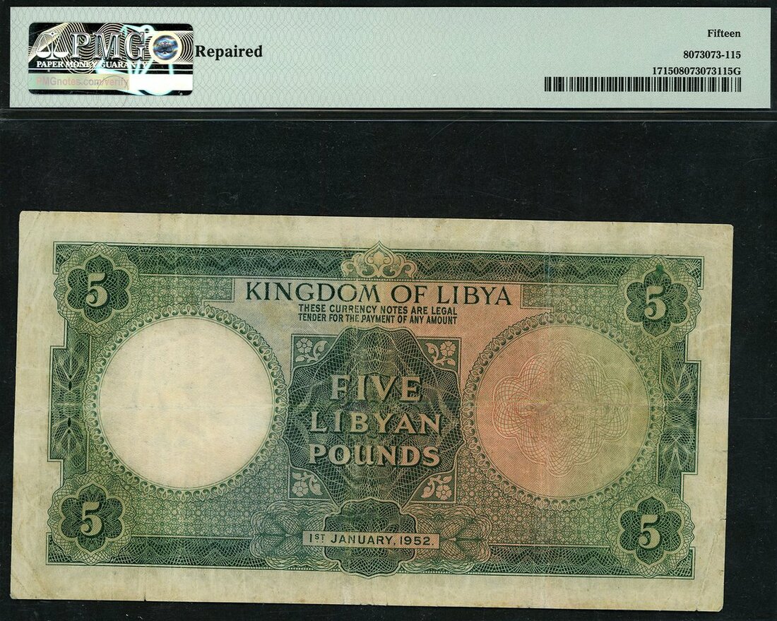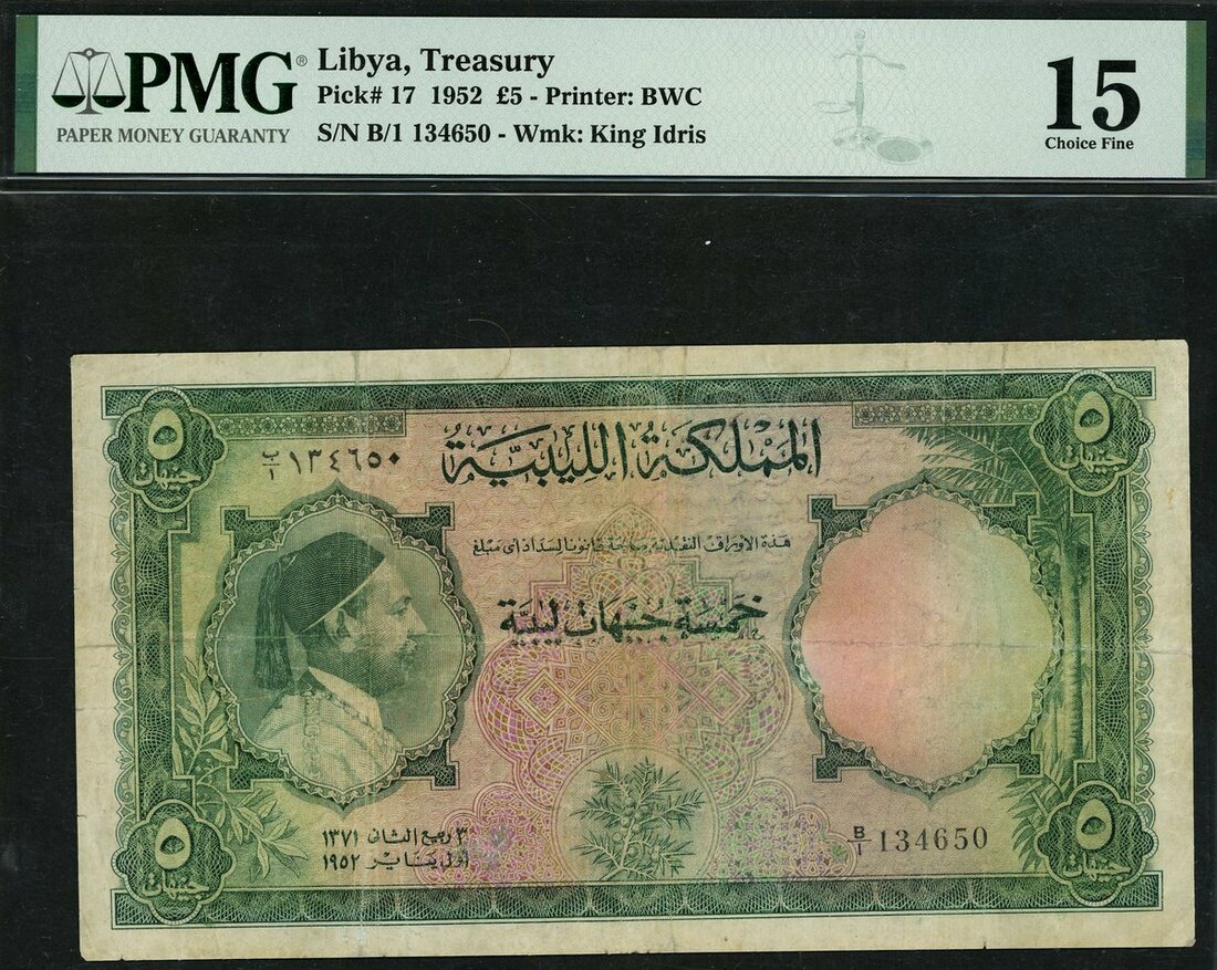 (x) Kingdom of Libya, 5 pounds, 1952, serial number B/1 134650, green, pale lilac and pink, King Idris at left, bush low centre